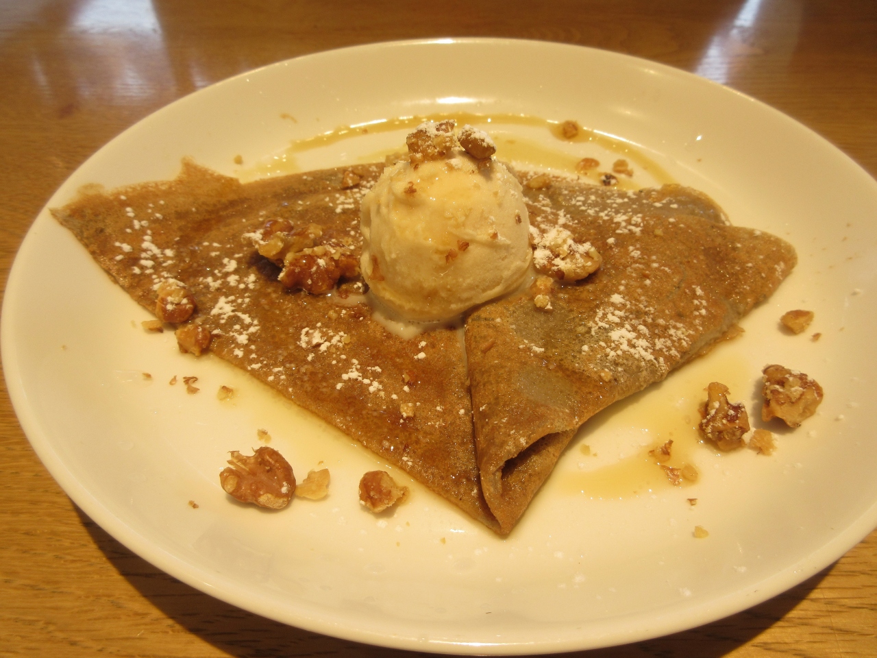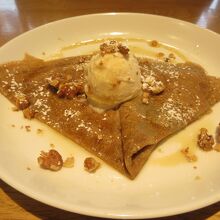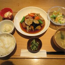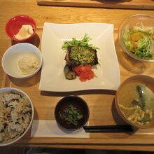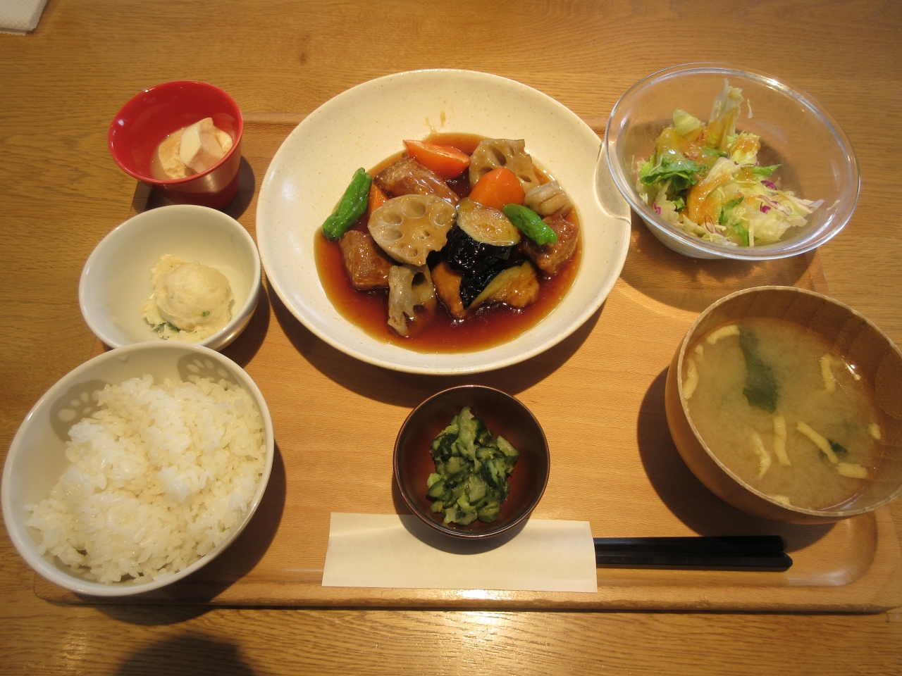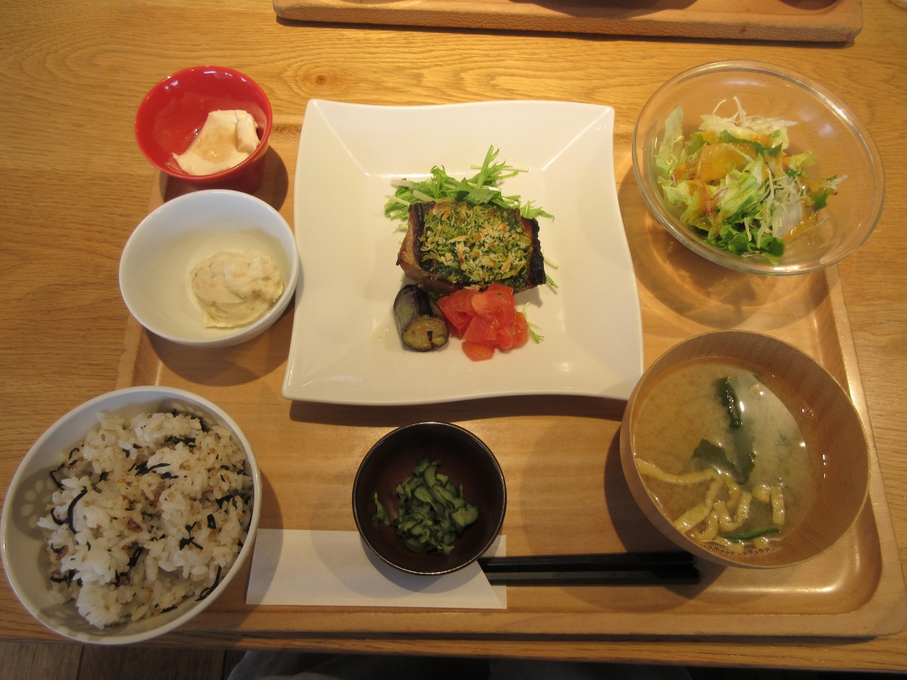 上野駅前の上野の森さくらテラス2階にあります。女性に人気の店で休日の昼は外で待つ人がいます。平日東上野六丁目の寺町を散策した帰りに午前11時過ぎに行きました。店内は空いていました。根菜と豚肉の黒酢ソース定食を白飯で、週替わり魚定食を五穀ひじきごはんで注文しました。根菜と豚肉は味がしっかりついていて美味しく、白飯をセルフでおかわりしました。魚はアジの大葉ソースでトマトや水菜や揚げナスが少量ついていました。味のついた五穀ひじきごはんと合いました。ミニサイズの胡桃そば粉クレープ塩キャラメルアイス添えをデザートにしました。もっちりしたそば粉クレープと胡桃が美味しく、あっさりした塩キャラメルアイスにも満足しました。