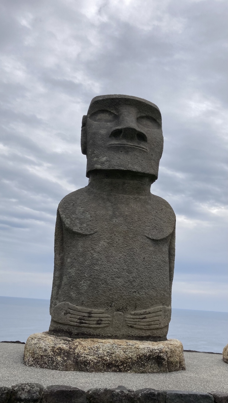 像のお顔がもう少しバラバラだったら良かったのに…(!)日向灘をバックに立っているが、本当は海を見て立ちたかったのじゃ…(?)