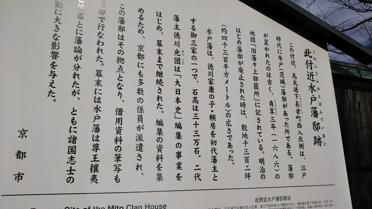 護王神社を見終わり北へ向かってる途中に目に入ってきた。かつて水戸藩邸(茨城)があった場所。京都に影響を与えた例として、徳川光圀の「大日本史」編集事業。その拠点となったのがここの場所である。