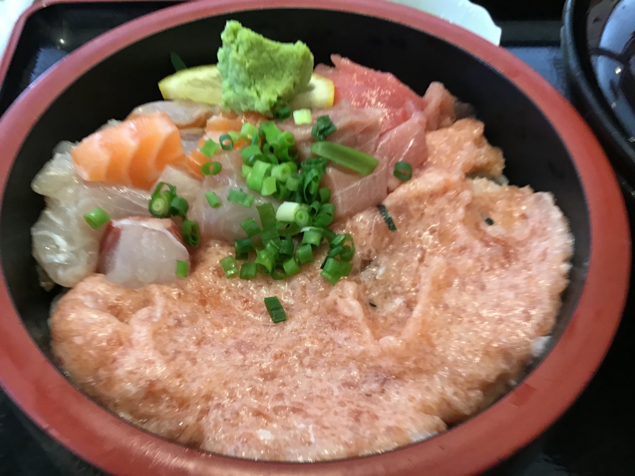 週末のランチで、ねぎとろ丼定食(680円)を注文したのですが、たっぷりのねぎとろに、お刺身もいくつか乗っかっており、値段の割に充実した内容です。