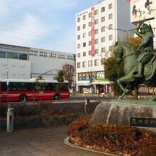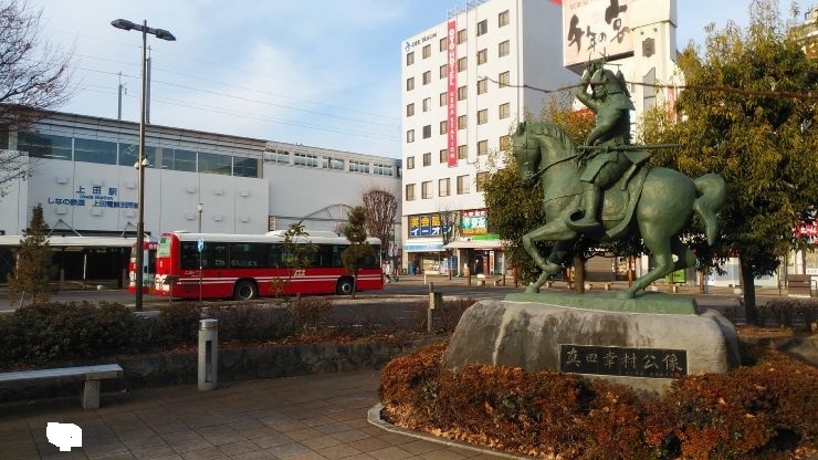 北陸新幹線上田駅、お城口出口ロータリーに設置された銅像。しっかりとした造りで存在感があった。