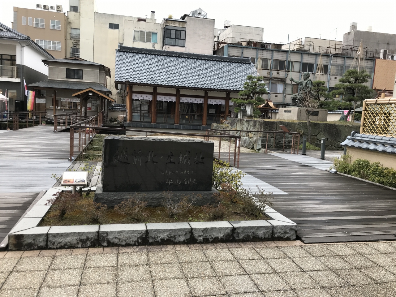 福井駅から歩いて数分の所にありました。こんな街中に柴田勝家の居城があったとは思いませんでした。現在は公園として石垣などを見ることができます。実際の規模はなかなか創造できないのが残念です。近くには神社があり、柴田勝家が祭られていました。