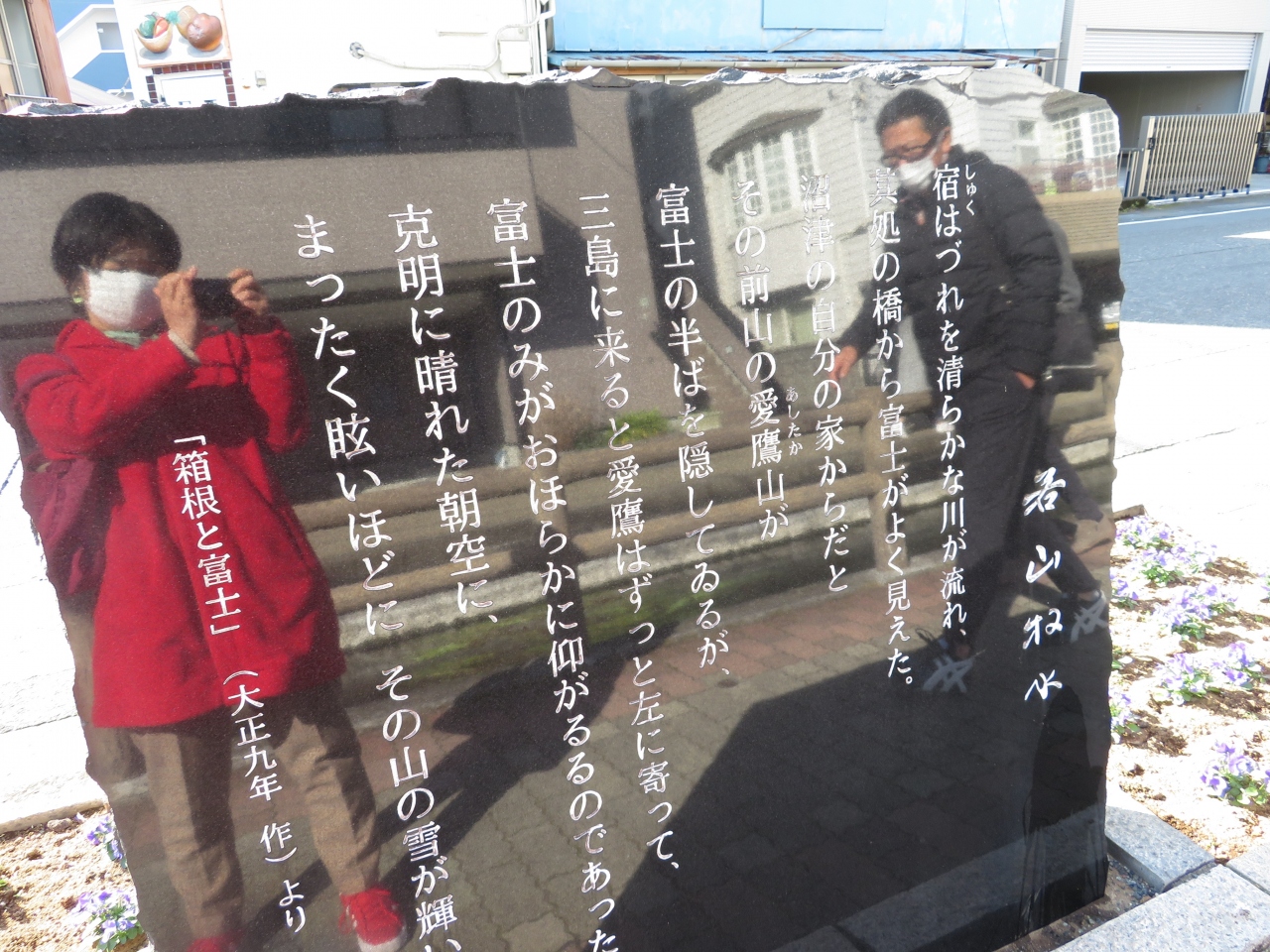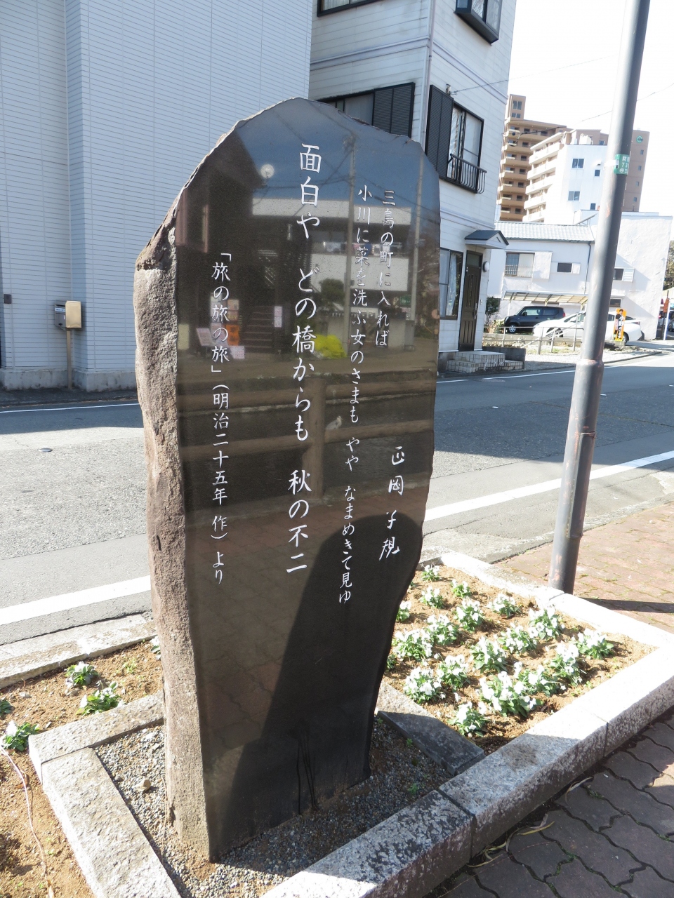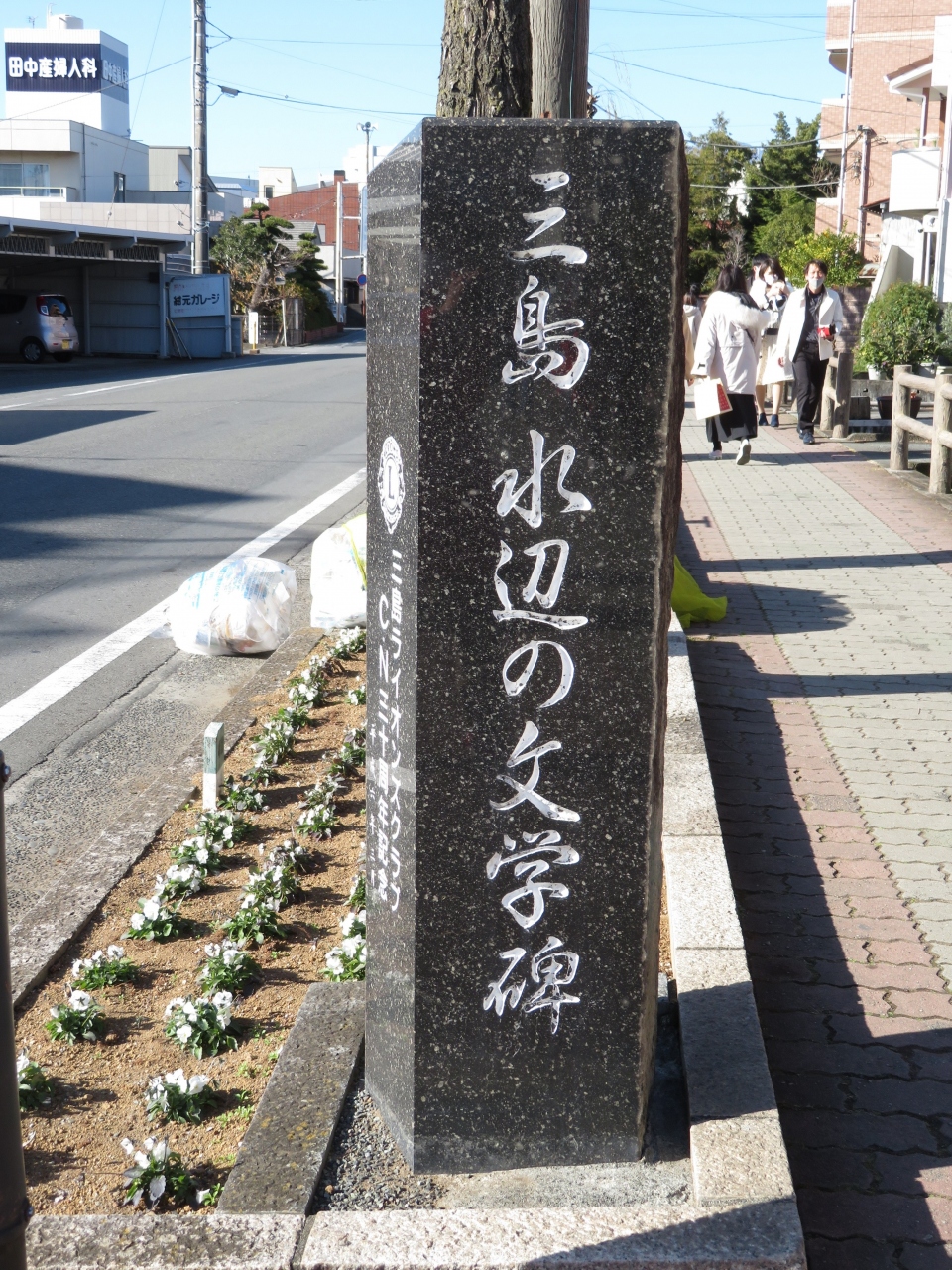 駅方向から白滝公園を過ぎ、桜川にそう道ぞいに文学碑が置かれています、大岡信、太宰治、正岡子規、夏目漱石、若山牧水、松尾芭蕉ら三島や富士を読んだ碑がありました、何気に置かれている碑ですが、足を止めて見る人も。小さな所まで手の込んだことをしているのがこの町の魅力です。