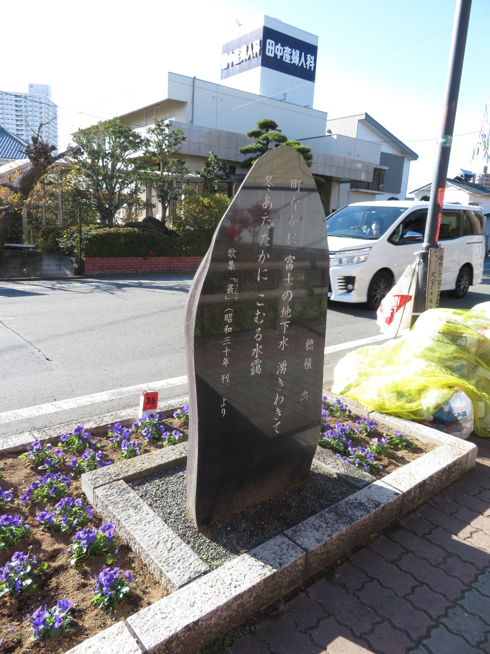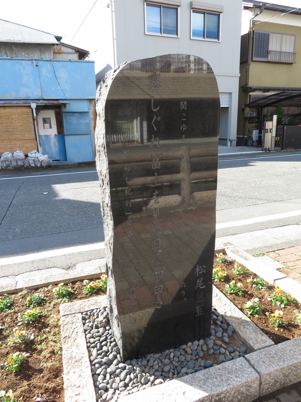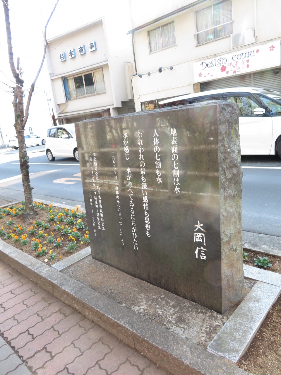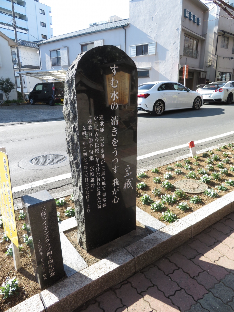 駅方向から白滝公園を過ぎ、桜川にそう道ぞいに文学碑が置かれています、大岡信、太宰治、正岡子規、夏目漱石、若山牧水、松尾芭蕉ら三島や富士を読んだ碑がありました、何気に置かれている碑ですが、足を止めて見る人も。小さな所まで手の込んだことをしているのがこの町の魅力です。