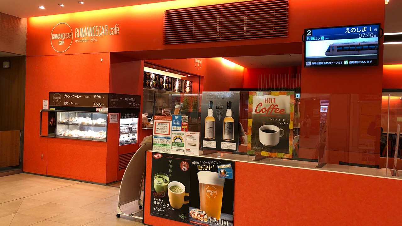 小田急新宿駅、地上のロマンスカーホームにあります。改札内です。店の外観は、昔のロマンスカーの色(朱色のような)で大変目立ちます。ホットコーヒー税抜291円で、普段使いもできる手頃なカフェです。早朝6:30から開いています。