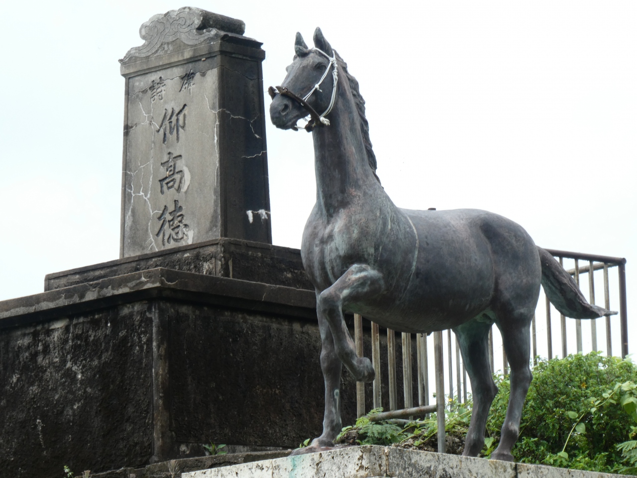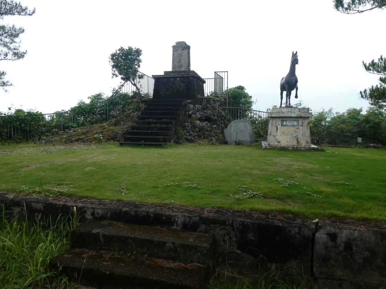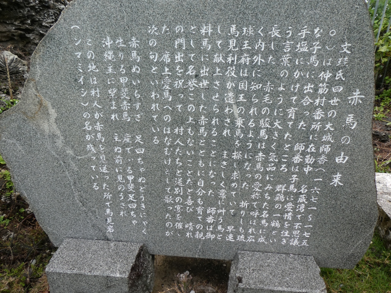 解説の石碑によると琉球王朝時代の話でこの付近を統治していた役人大城師番が名蔵湾で見つけた子馬を大切に育てその気品ある姿は国内外に知れ渡り遂に琉球国王に献上されたと言うストーリーです。