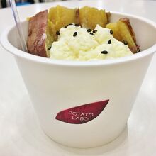 阪急西宮ガーデンズ1階のテイクアウトスイーツコーナーにあります。2019年10月にオープンしたお芋スイーツ専門店です。スプーンで食べるスイートポテトやおいもパフェにおいものラテ等お芋づくしのメニューが並びます。お芋そのものを頂きたいので“紅はるか焼きいもバター”を注文しました。カップはさほど大きくはないのですが、焼き芋は中にも沢山入っていて結構お腹が膨れます。バターはポテトに合わせて生クリーム等を混ぜているとのこと、お芋の熱であっという間に溶けるので別にしてもらえたらと思いました。お芋はホクホクで美味しかったです。