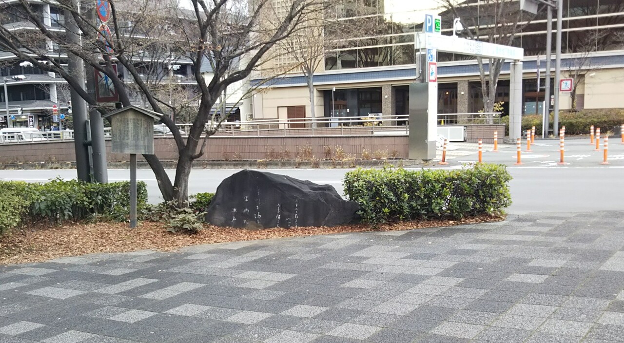 御池大橋の西詰の南にあった松目漱石が詠んだ句が刻まれた石と駒札。御池大橋の南側を渡る人なら気が付く位置にある。大きい石だから目に入ってくる。彼は4回京都に来てる。そのとき知り合った祇園の茶屋の女将のことを思って詠んだ句。