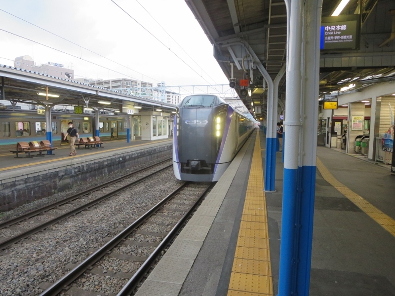 久しぶりに「あずさ」に乗りました。常磐線特急と同じように全車指定席となり、座席の上のランプが赤は空席、黄色くなったら次にもうすぐ乗車してくる、乗車したら緑となりました。列車の前の紫のラインはかっこよく、空いていたのでゆっくりできました。