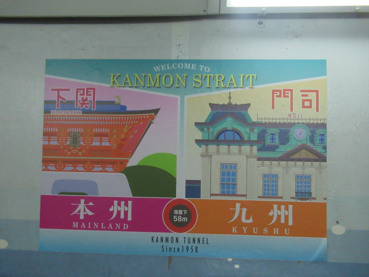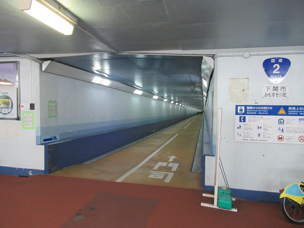地下60mなのでエレベーターで降りるのには時間がかかります。下関までは780m。途中で福岡県(九州)と山口県(本州)の境界線があります。ここは海の中です。自転車とバイクは押して通ります。門司側で半分スタンプを押して、下関側で残り半分スタンプを押して完成させて、門司港駅の観光案内所などに持っていくと、TOPPA記念証がもらえました。下関側のエレベーターで上がったところに料金箱があります。人は無料。自転車とバイクは20円です。