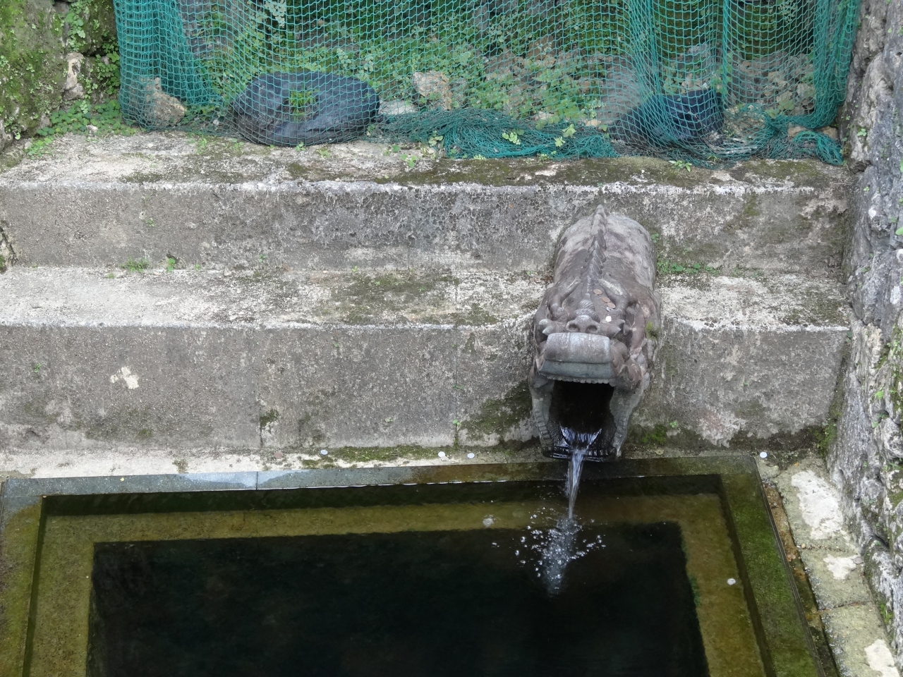首里城本殿へ向かう際になだらかな階段状のスロープを上る途中にあります。瑞泉門の手前になりますが、龍の頭の形をした口から湧水が流れ出ていて、この名がつけられたものですが、この龍は中国から贈られたものです。これも世界遺産の一部となります。