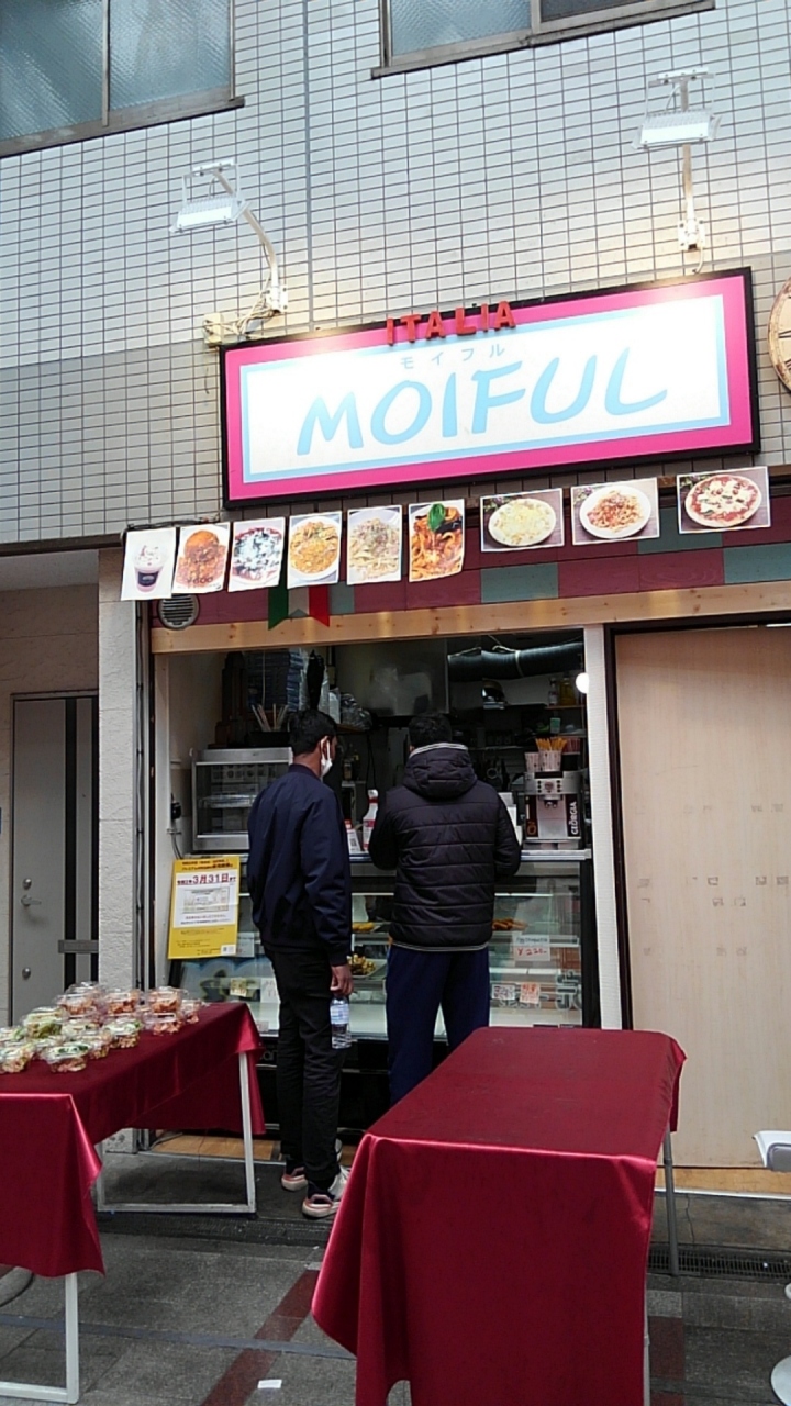 モイフルは、十条駅すぐの場所にある十条銀座商店街にあるイタリアンのテイクアウトの店です。以前はなかったような、別の店だったような気がしますが。ピザ、パスタ、ライスボールなど購入できます。店の前にベンチがあるのでそこで食べることができるのかも。