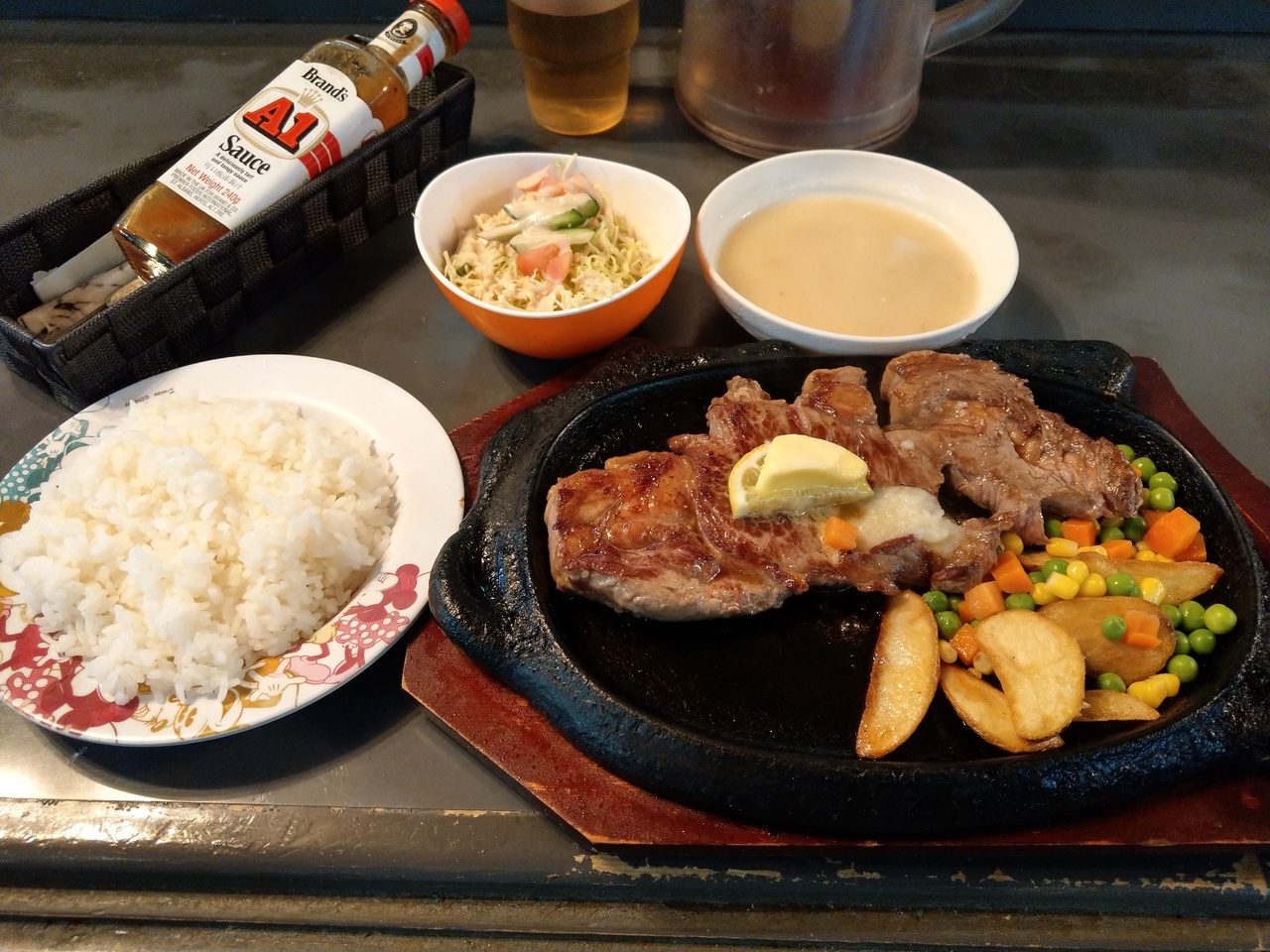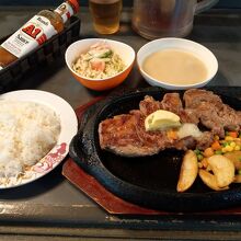近くの別の店に行くつもりが臨時休業だったため、恐らく10年ぶりぐらいに訪問。店内もメニューの豊富さも、記憶の中と何も変わらずワクワク。毎日3食食べられる程のメニューから、ステーキ(サ―ロイン)250gのセット 1530円。高級店以外で沖縄によくある町のステーキハウスと比べてもお得感あり。