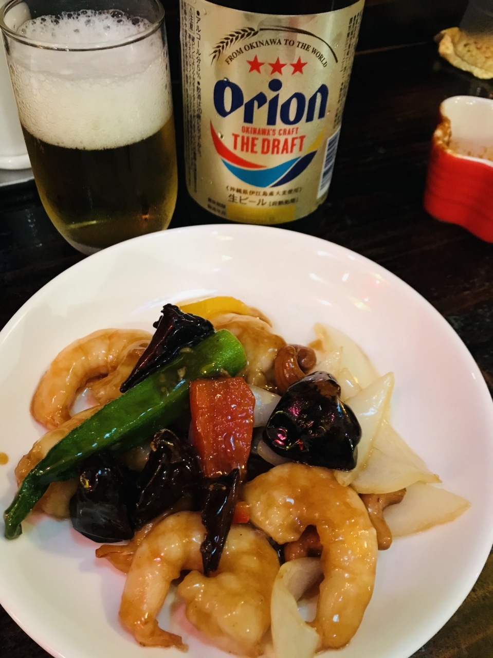 今回は、バンバンジーと車エビの醤油炒めをいただき、瓶ビールもオーダー。