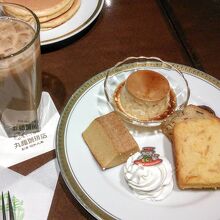 昭和9年創業の老舗珈琲店です。コーヒーは、何も言わなければ、加糖状態で提供されるので、ブラックが好みの方は注意が必要です。10分かけて銅板で焼きあげるレトロなホットケーキは、表面がサクッと焼き上がっていて、バターとメープルシロップをしみこませておいしくいただきました。もう一つの人気レトロメニューのプリンがのったケーキセットも注文、オレンジピールのパウンドケーキ、マロンペーストを生地に練りこんだ栗のパウンドケーキ、プリンと同じくこだわり卵を使用して焼き上げた丸福バウムクーヘンが味わえるセットでした。