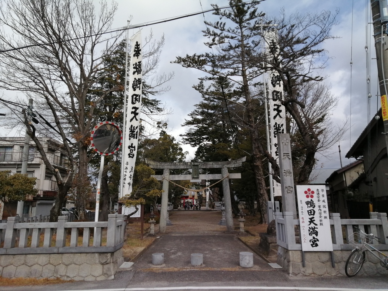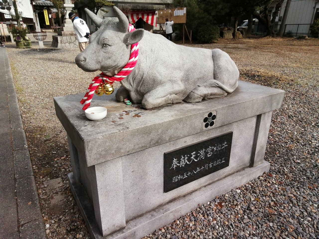 鴨田天満宮の境内は南北に長く、参道入口は拝殿から約140mも離れています。まずは一の鳥居をくぐります、そして朱塗りされた二の鳥居へ。とても愛くるしい一対の狛犬がお出迎え。そして拝殿へ。参拝者は多くはありませんできたが、境内が広いので完璧なソーシャルディスタンスが取れていたと思います。ついでに“牛ちゃん”をなでなで。天満宮と牛は所縁が深いのでどの天満宮にも必ず祀られています。丑年である今年にはぴったりの初詣場所だと思います。とてもいいご利益がありそうです。