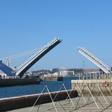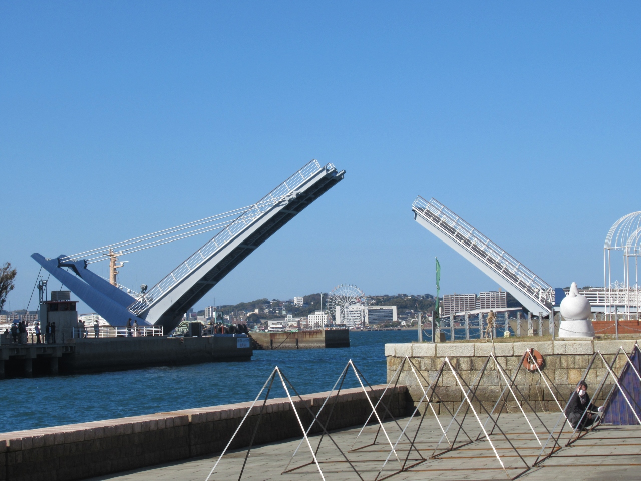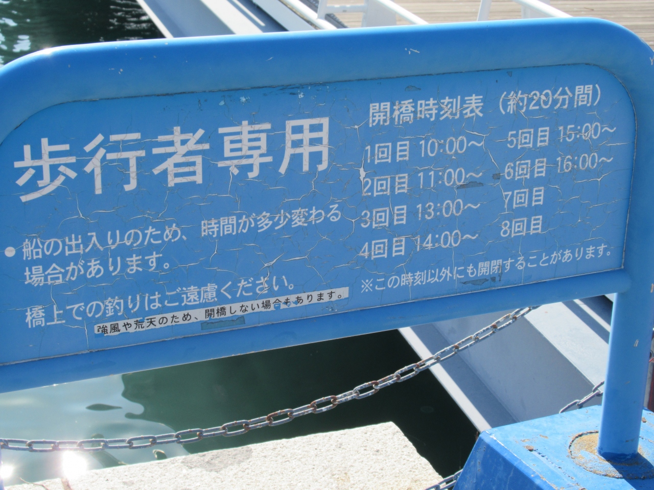 日本最大級の歩行者専用跳ね橋で、全長108m、開橋は1日6回(20分)4分かけて上がります。「PREMIER HOTEL 門司港」の海峡側の部屋の窓からすぐ近くに見えました。最大開いたところは見ごたえあります。