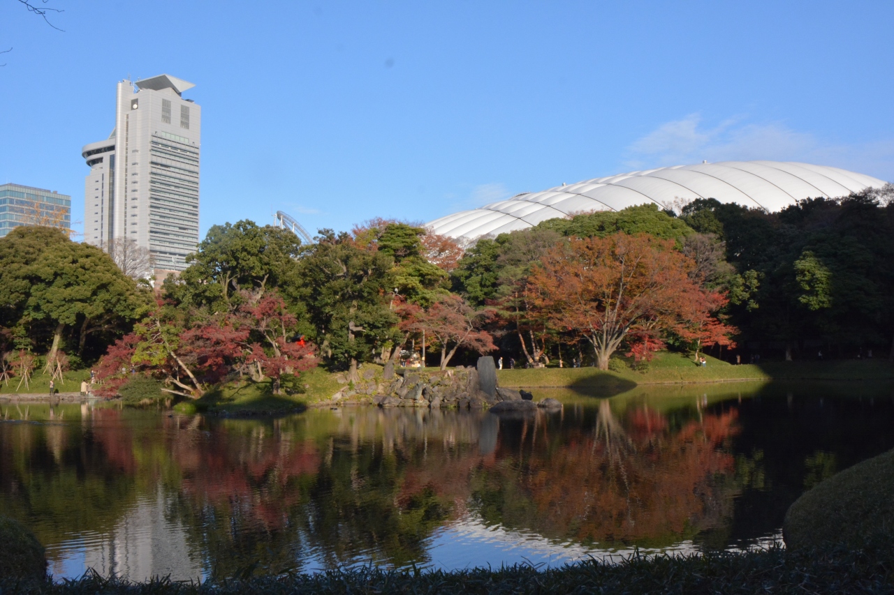 東京ドームの屋根を借景に眺める紅葉に色づいた日本庭園。
