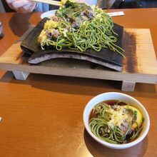 海峡プラザには瓦そばのお店が2軒。しかも1階と2階に重なるようにあってびっくり。たかせ門司港レトロ店は海峡プラザ西館2階にあります。温かいつけ汁にレモンの輪切りともみじおろしをいれて食べます。熱い瓦で茶そばがおこげになっておいしいです。