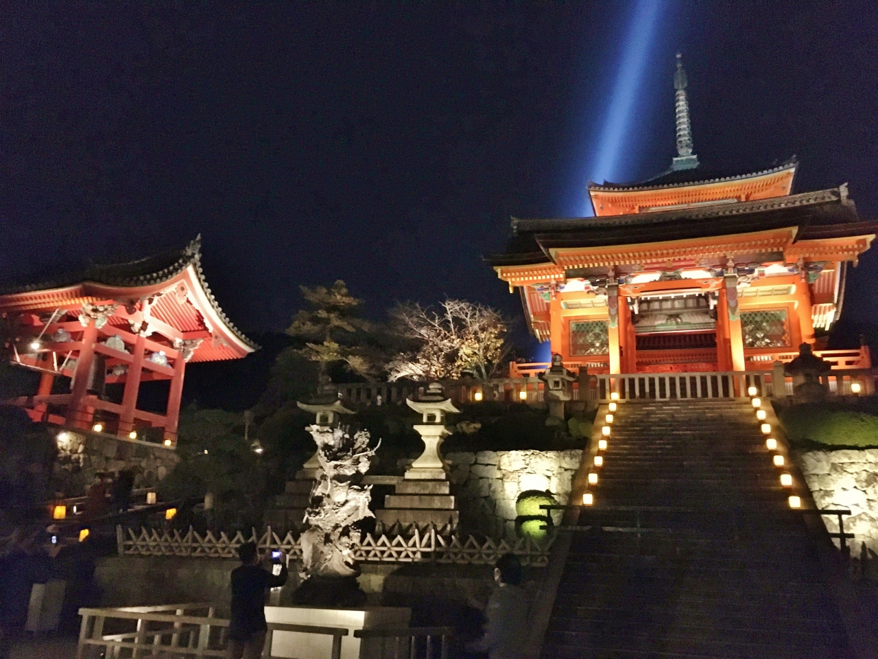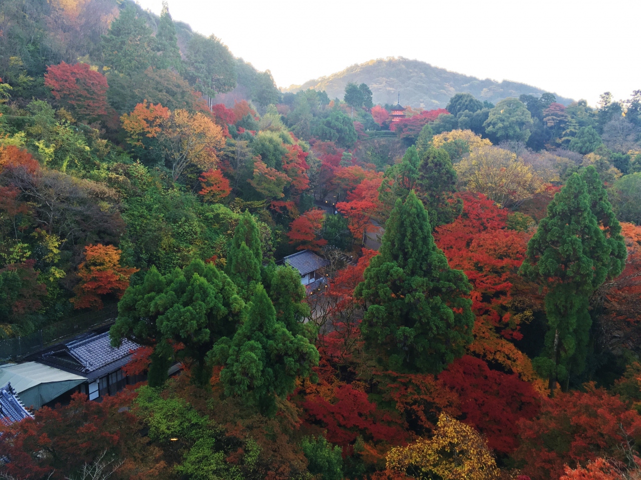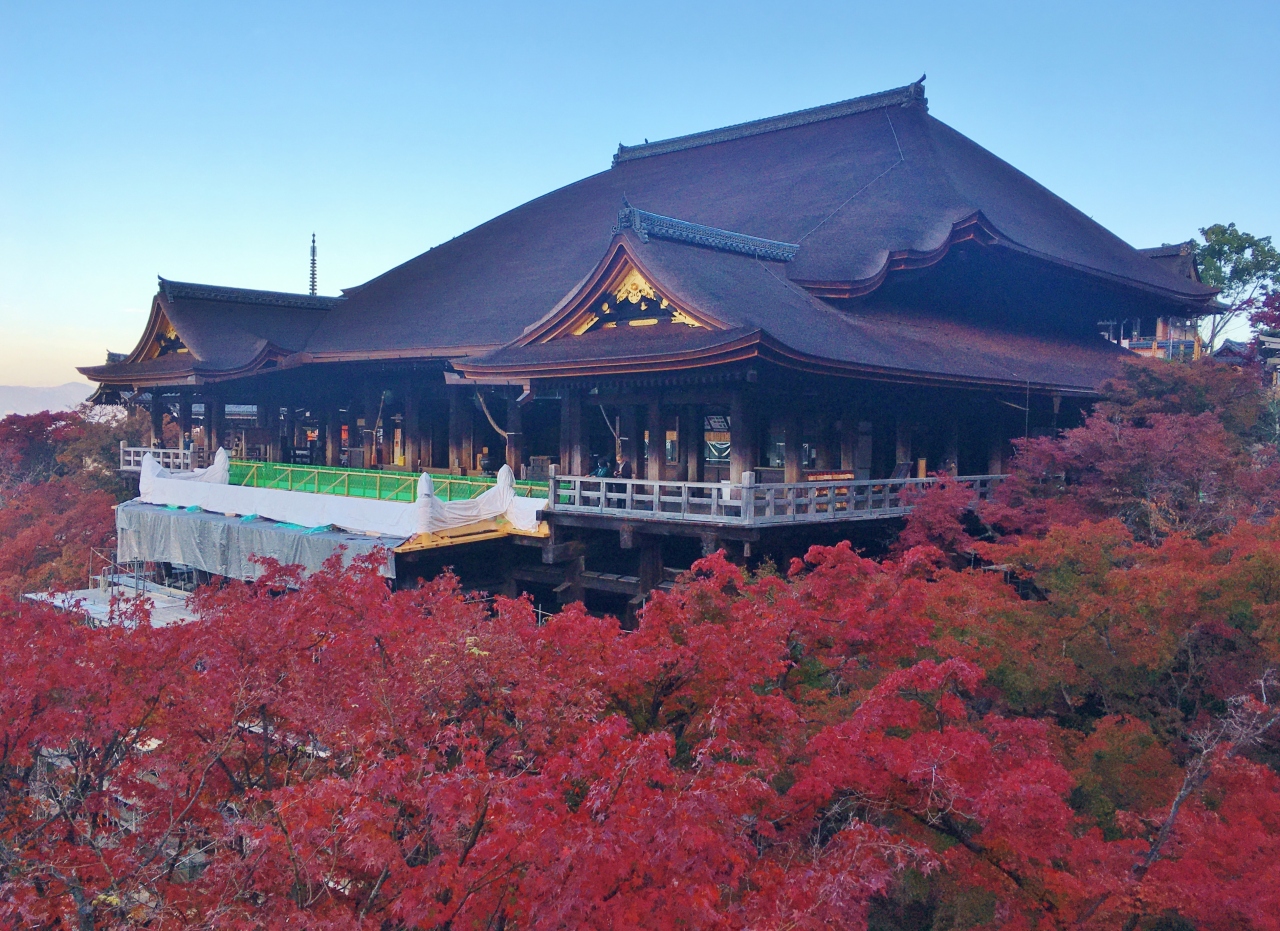 京都で最も有名で世界遺産にも選ばれ、多くの参拝客で賑わうお寺のひとつです。お寺の近くに宿泊したので、久しぶりに紅葉のライトアップを見に行きました。新型コロナの影響で日中の拝観とは別に並ぶ必要なく、そのまま受付で拝観料を払って入ることができました。舞台はまだ工事中でしたが、紅葉はちょうど見頃でを迎えていて綺麗でした。翌朝、清水寺は開門が6時と知り、朝の散歩に出かけました。明るい境内は紅葉の赤が映えてとても素晴らしく、殆ど人のいないお寺をゆっくりと回ることができました。