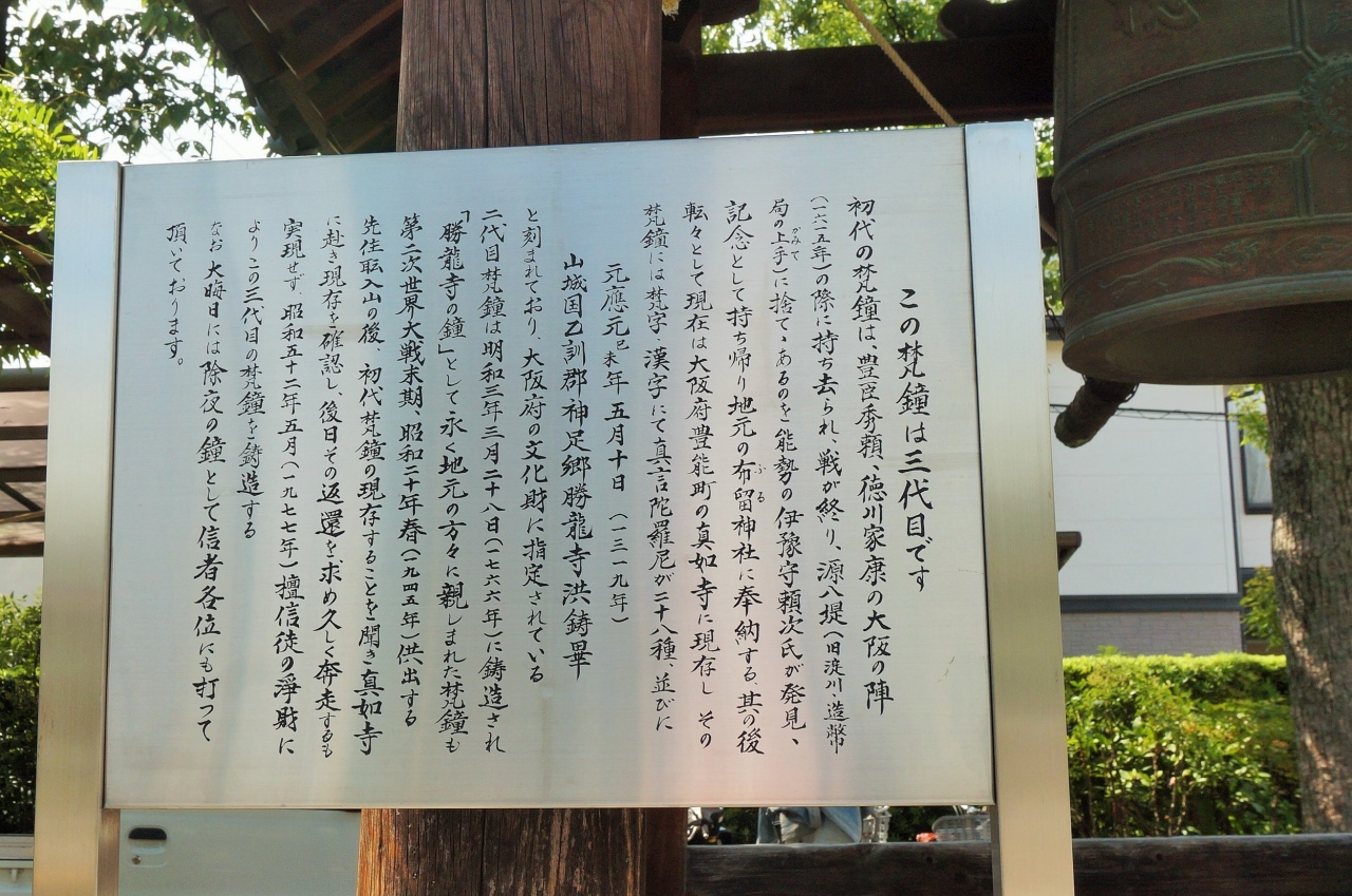 初代の梵鐘は大阪夏の陣の際持ち去られ転々とし、現在は能勢町の真如寺に現存し、大阪府の指定文化財となっています。