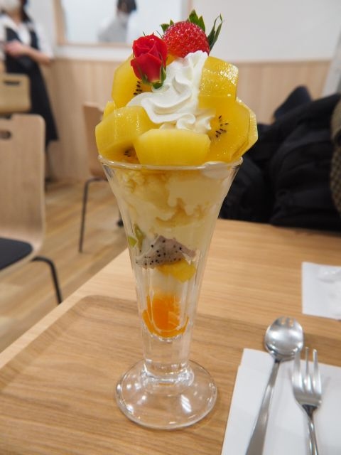 同店ではキウイパフェは2種類あり、グリーンキウイとサンゴールドキウイから選べた。グリーンのキウイはこれまで何度も食しているので、今回はあまり食べた覚えが無いサンゴールドキウイを選択。