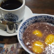 カボチャ入りの白玉団子を使っていて、黄色い白玉(最早白くない)が映えている。