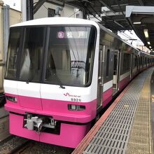 電車は派手なピンク色。普通の塗装でここまで派手な路線はなかなかないでしょう。