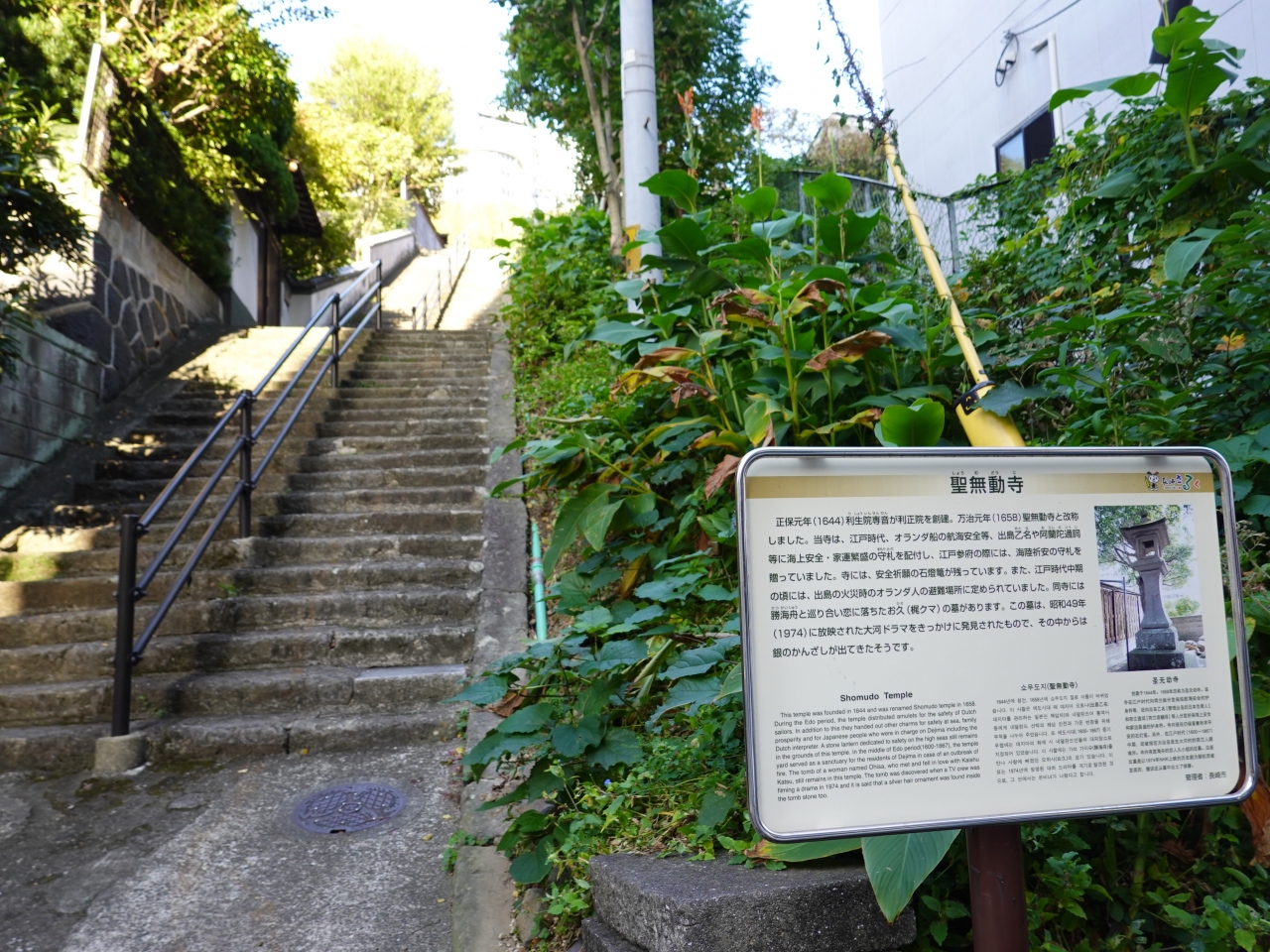 長崎市の筑後町には数多くのお寺が点在していますが、真言宗御室派の聖無動寺もそんな中のひとつです。石段の途中にあるお寺で、本堂は小ぶりで目立たず、ともすると民家と見間違えてしまいそうな外観です。一方で、墓地には勝海舟と恋に落ちたお久のお墓があり、歴史好きな方には興味深いお寺だと思います。
