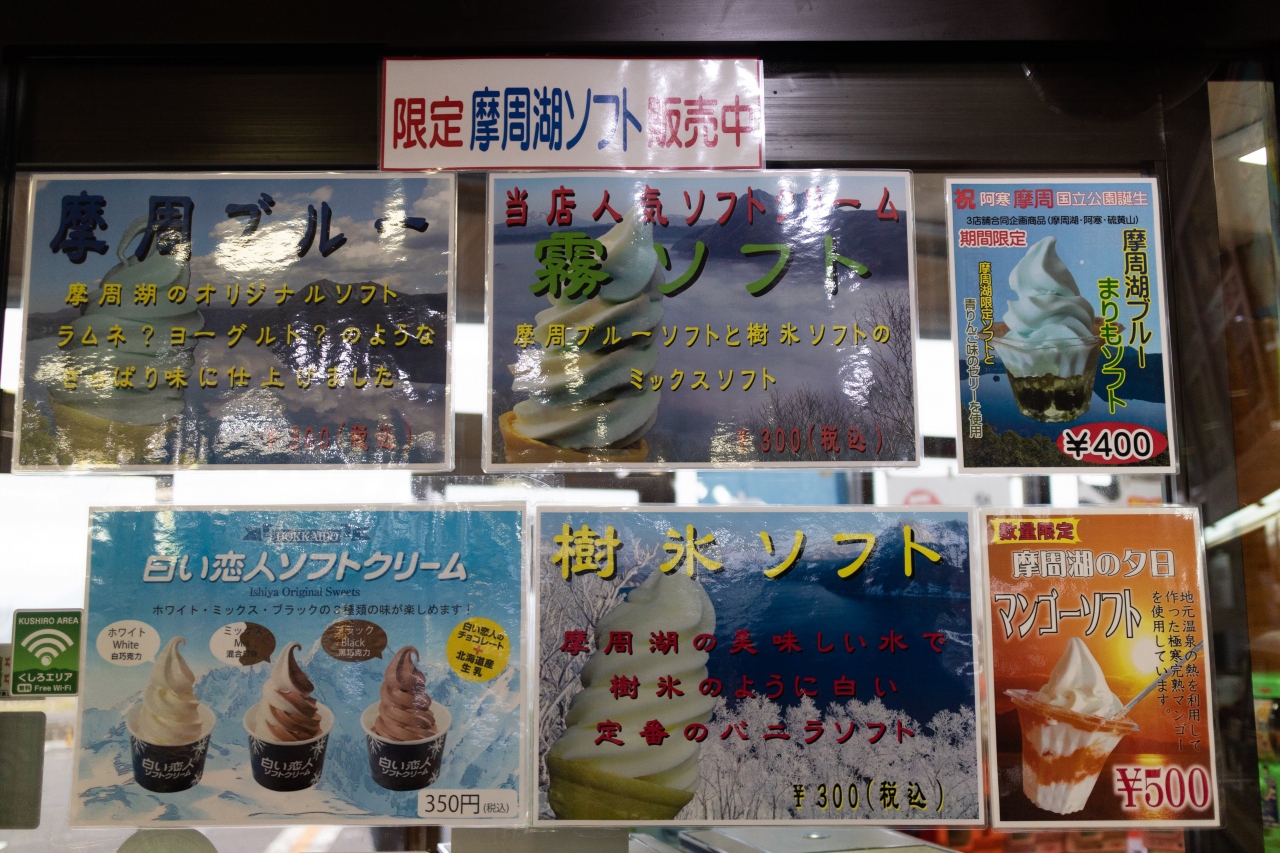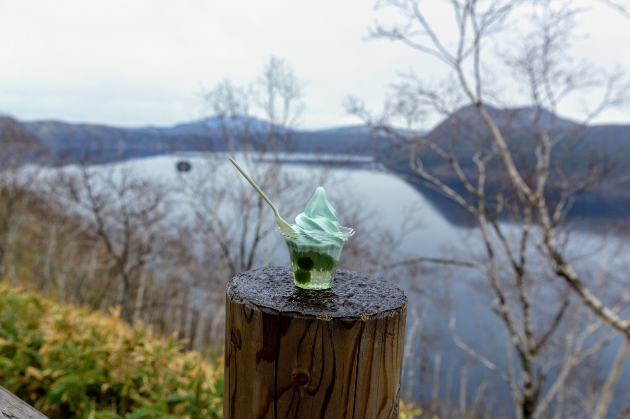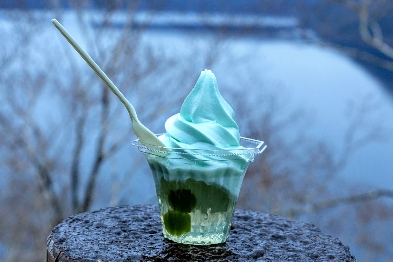 北海道・女満別空港から2時間。道東エリアの人気観光スポット「摩周湖(ましゅうこ)」。霧の日が多いのですが、晴れた日には「摩周ブルー」と呼ばれるうつくしく透き通ったブルーの湖がみられます。その摩周湖を望むことが出来る「摩周湖 第一展望台」ではソフトクリームの種類が豊富です。ソフトクリーム好きとしては悩みますね・・・ 「摩周ブルーソフト」「霧ソフト」「樹氷ソフト」と気になる商品が並んでいますが・・・限定の「摩周湖ブルーまりもソフト」を食べました。青リンゴゼリーが入ったカップに入ったラムネ風味のソフトクリームです。口あたりはシャーベット系ミルク感はそこそこでさっぱり系のソフトクリームでした。食べ方としてはソフトにゼリーを混ぜて食べると美味しいですよ~