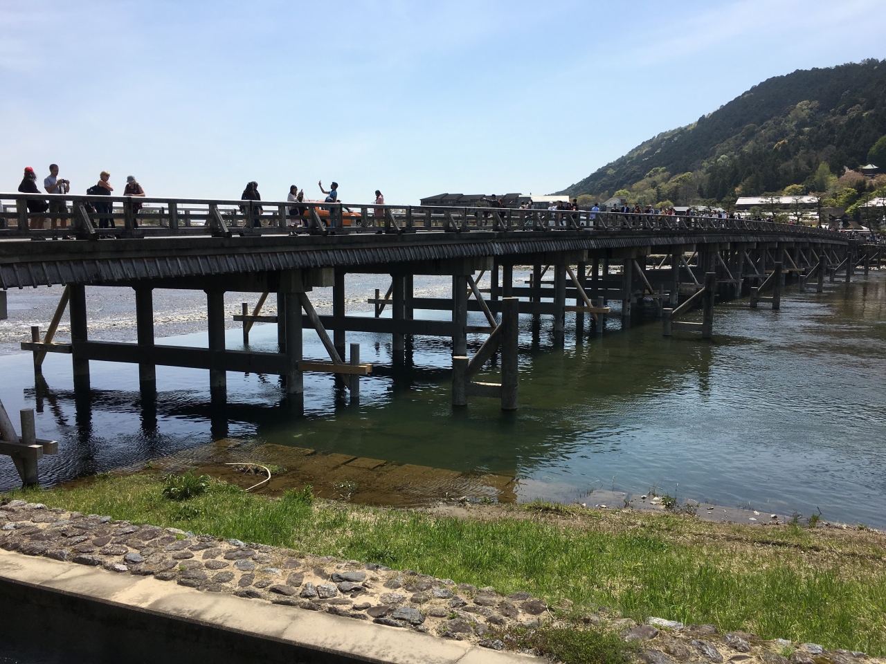 京都嵐山の観光のシンボルである橋です。阪急嵐山駅と京福嵐山駅のちょうど中間地点あたりにあり、人もコロナ前だと平日だろうがすごいものがありました。ただこの橋は普通に車が通るので、写真撮影に夢中になりすぎず安全安心に観光しましょう。