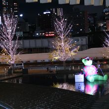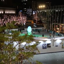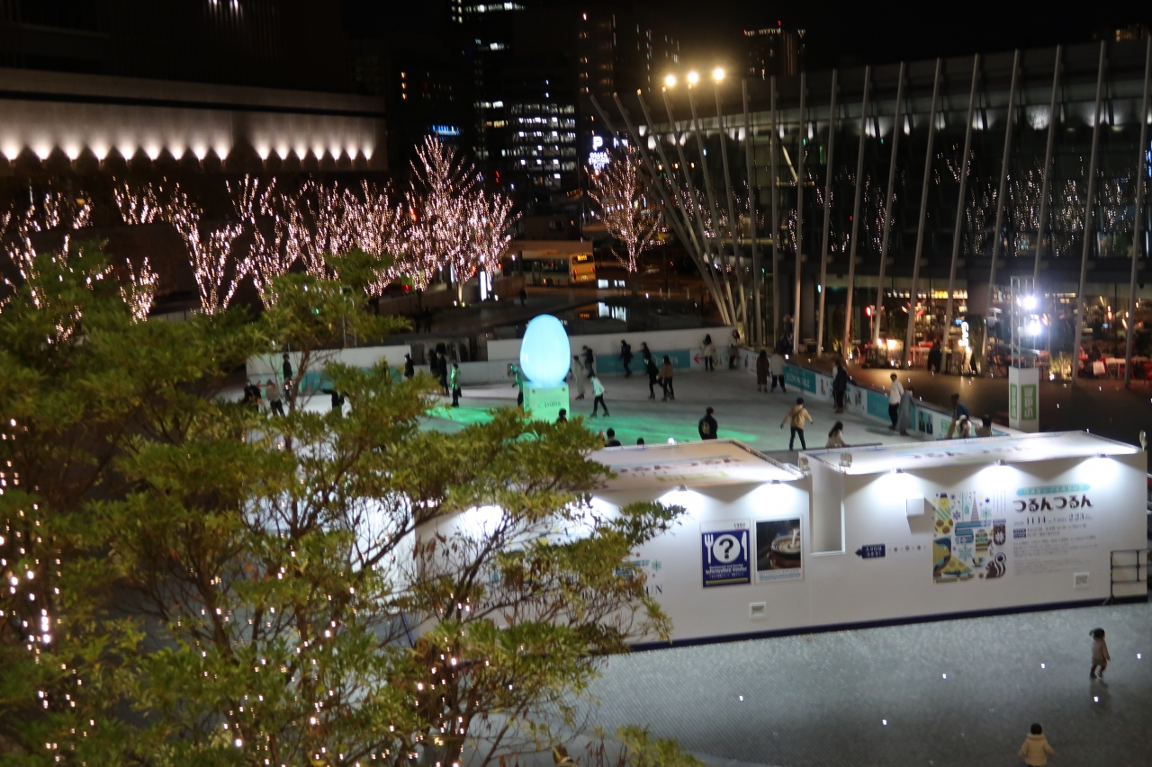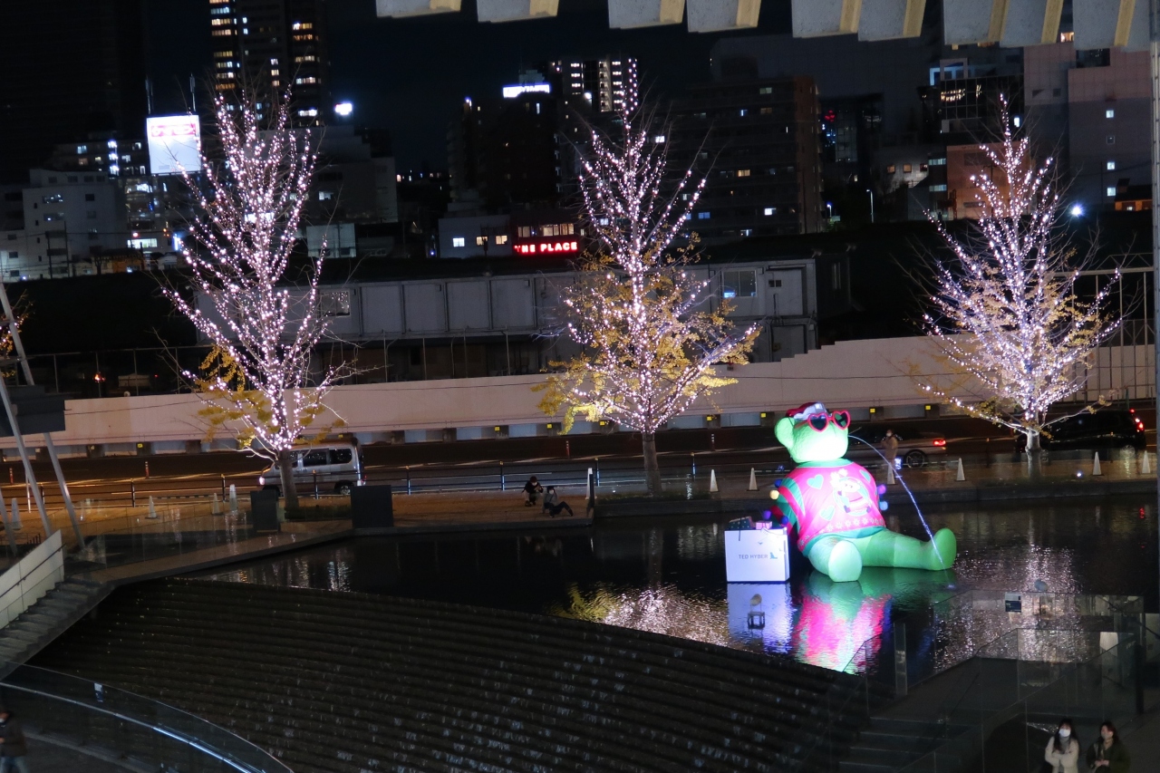 大阪駅北口とグランフロント大阪にはさまれた空間に広がっている広場です。夜に通りかかりましたが、ライトアップされていて、幻想的な雰囲気になっていました。ハートのサングラス、ピンク色の洋服を着た緑のテディベアTed Hyberが座っていて、お買い物を満喫したらしく戦利品を脇に置いて、口から水を吹いていました。クマの手前の空間は、なんとアイスリンクになっていて、暗くなっても、スケートを楽しむ人々でにぎわっていました。
