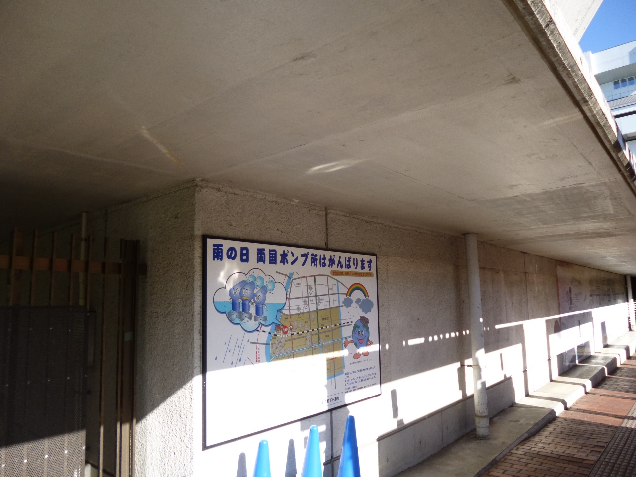JR両国駅を出てすぐ、商業施設、江戸のれんに沿って曲がると、両国ポンプ場があります。国技館と大江戸博物館に挟まれた形で建てられています。この場所には意味があって、この二つの大きな建物は、江戸東京博物館が2,500トン、国技館館が1,000トンの雨水タンクを持つ超大型雨水利用施設として建設されているそうです。ゼロメートル地帯も多い、この辺りでは、重要な施設なのだと分かります。