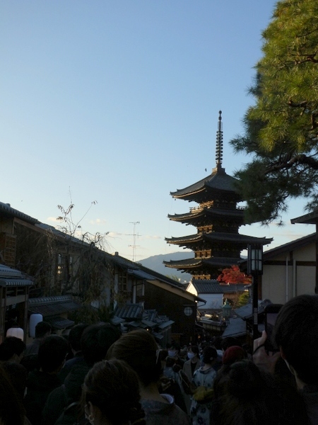 石畳の階段医療側には店が並び、八坂の塔が見えてとても絵になる風景です。