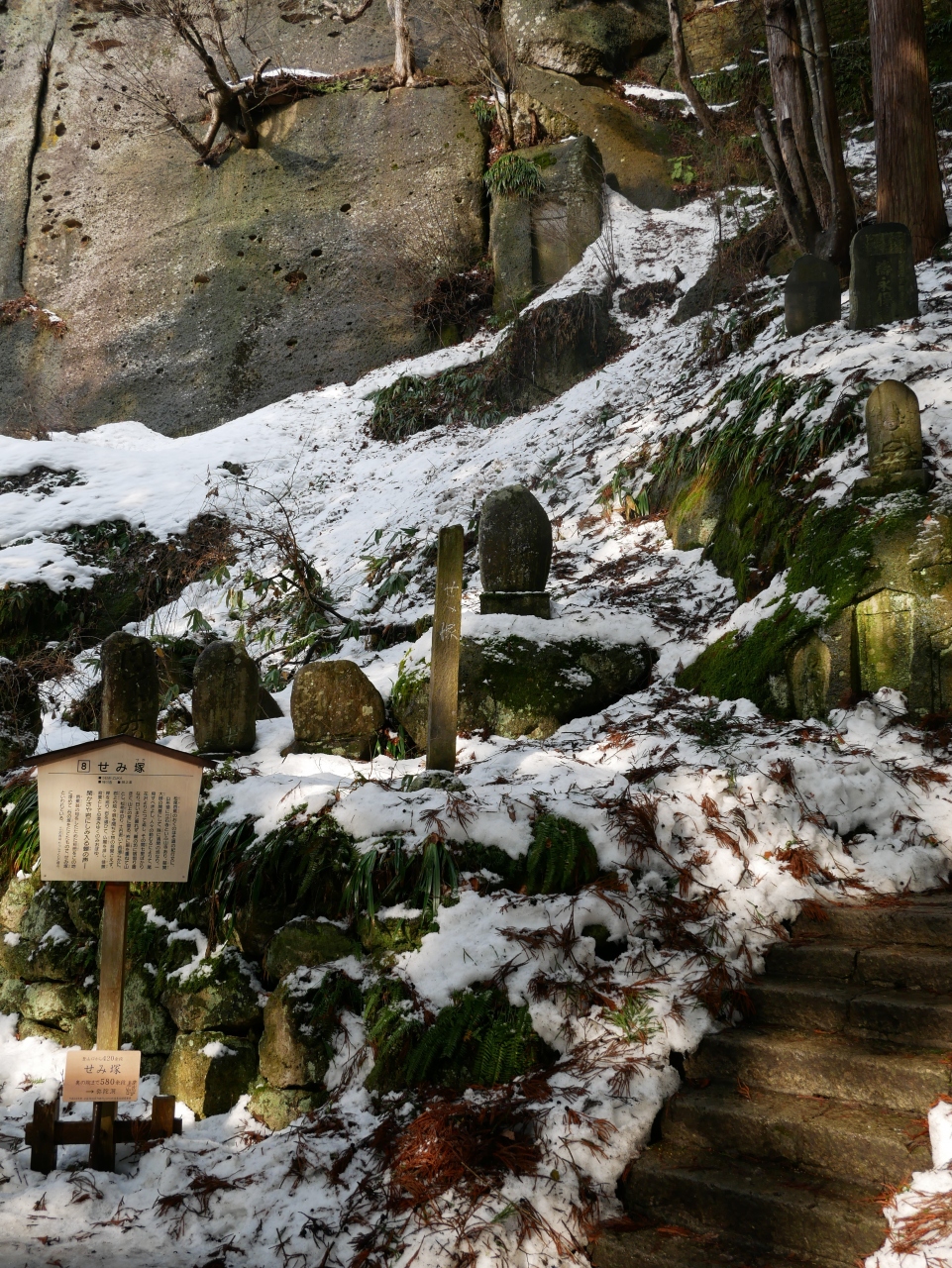 もちろん芭蕉の有名な「閑かさや岩にしみ入る蝉の声」に関するものではありますが、正直看板がなければこれがそうとは分かりませんし、句の短冊を埋めた跡と言われても、なぜここ?っていう感じでした。