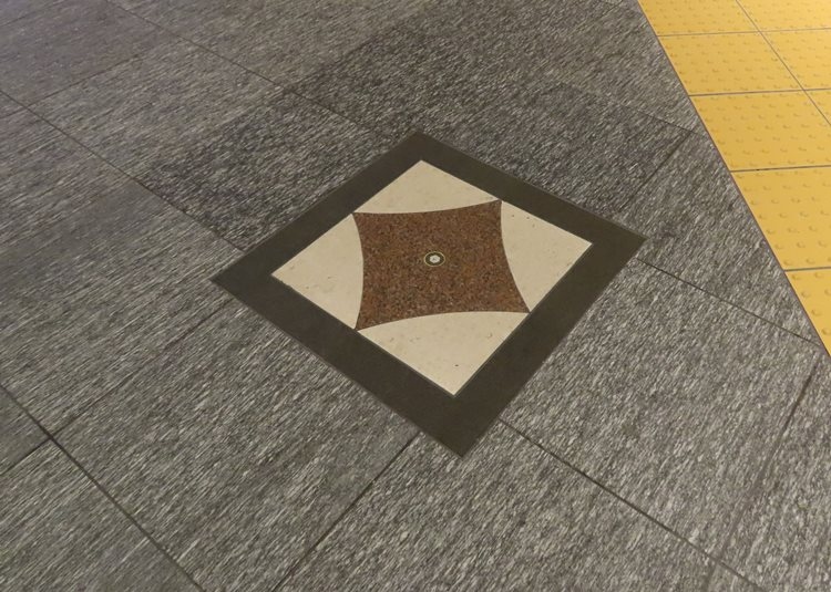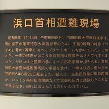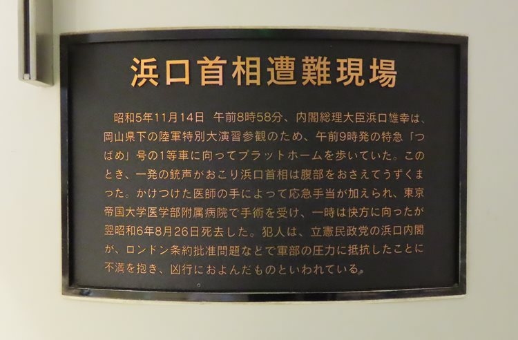 東京駅改札内。在来線から新幹線への乗換え改札のすぐ手前。JR東日本側にもJR東海側にも進める低い階段の下に小さなマーキングと事件のプレートが埋め込まれています。この場所もふだんかなり人が流れている場所なので、注目していると奇異な目で見られそうなぐらいでした。