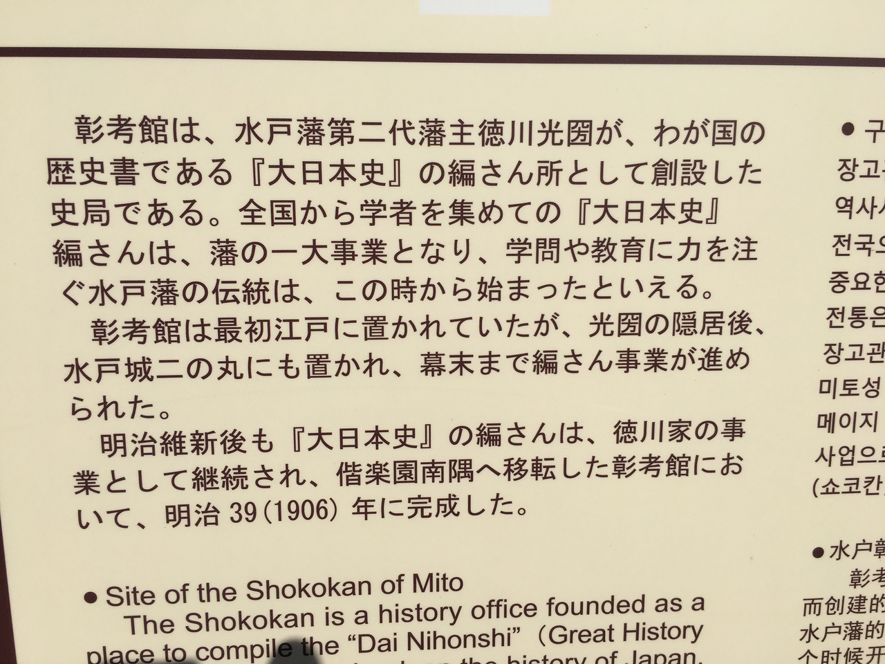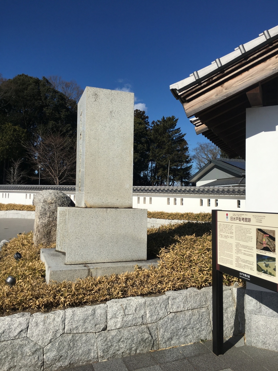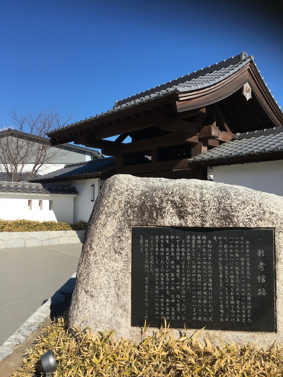 大きな門を潜り、天守閣でもあるのかと思ったら小学校がありました。正面には中学校があり、道路の左右には城の塀のようなものが繋がっていました。石の石碑があり、黒の下地に彰考館のことが記載されていました。石碑の後方には寺の山門のような建物があります。