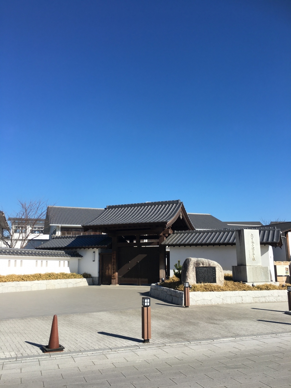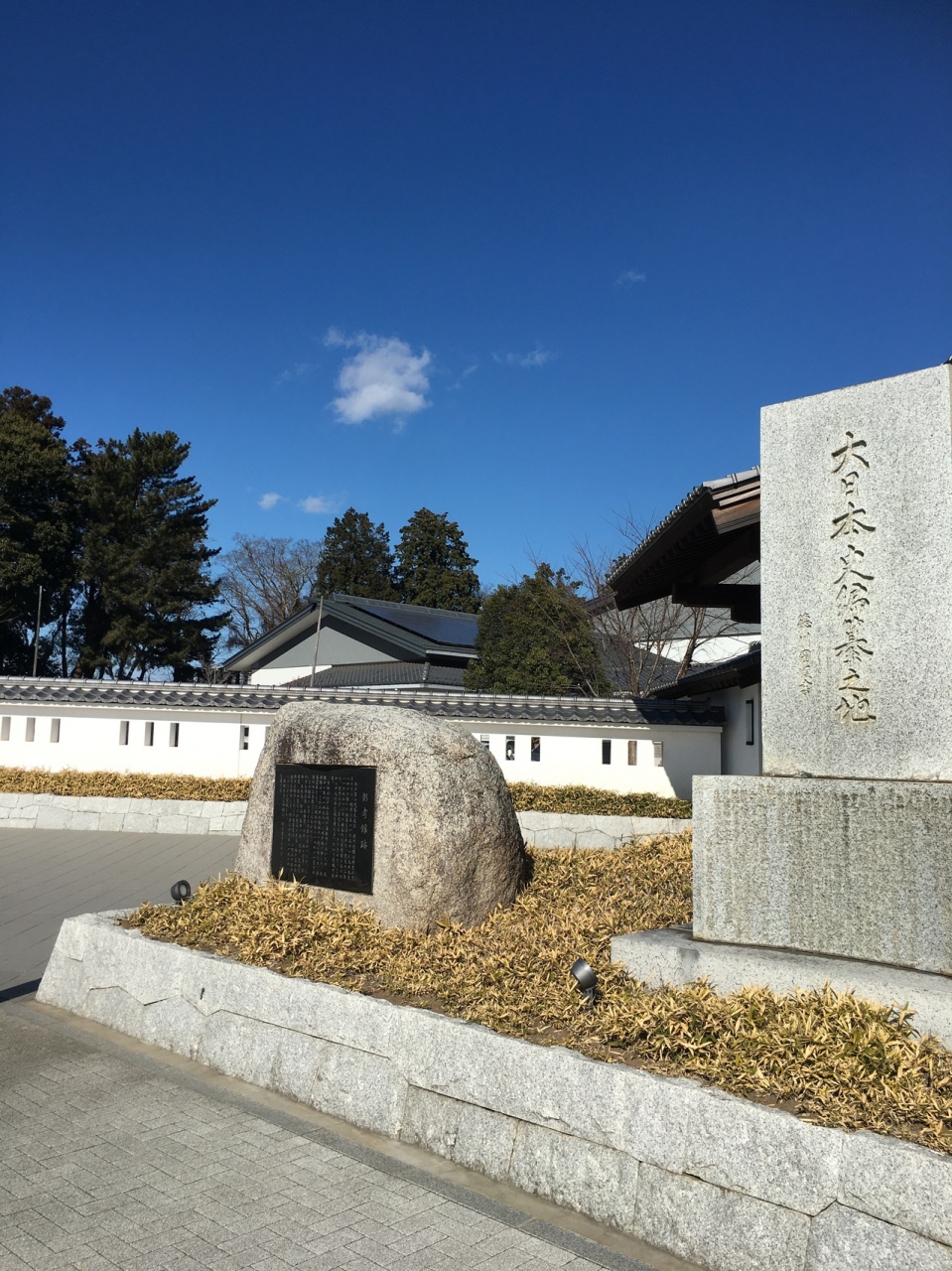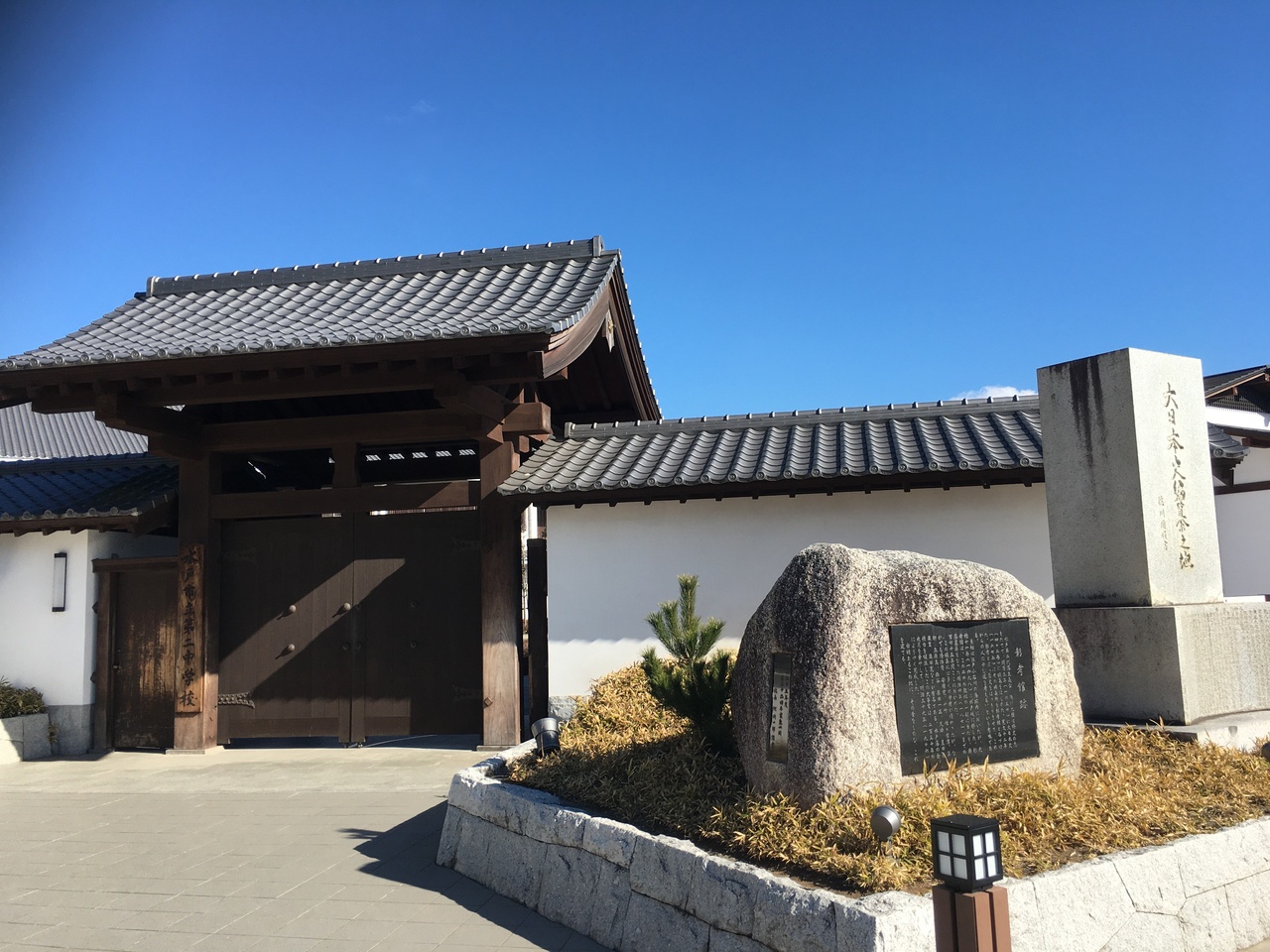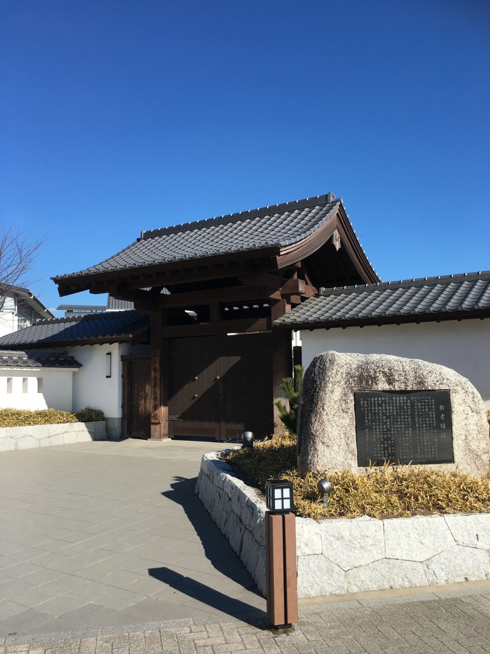 大きな門を潜り、天守閣でもあるのかと思ったら小学校がありました。正面には中学校があり、道路の左右には城の塀のようなものが繋がっていました。石の石碑があり、黒の下地に彰考館のことが記載されていました。石碑の後方には寺の山門のような建物があります。