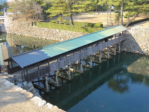 現在、西の丸跡と陸続きになっている高松城の本丸跡ですが、かつての本丸は水堀の中の浮島のように存在していました。その本丸に唯一架橋されていたのが、二の丸へと接続するこの鞘橋です。有事の際に切り落とせるように土橋ではなく、木橋で造られています。藩主や限られた人物しか通れない「御廊下橋」ではないのに屋根や壁(腰板)がついているのが珍しいなと思いました。一見現存遺構のように見えますが、現在のものは明治年間に架橋されたものだそうです。