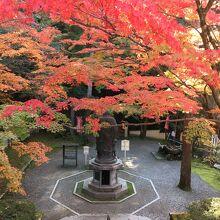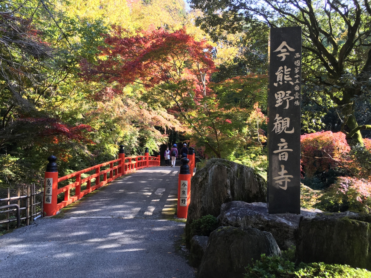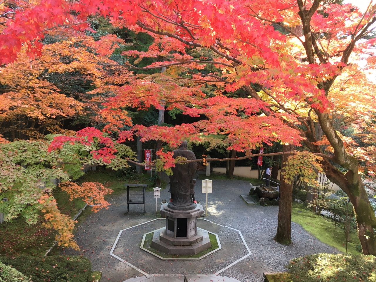 泉涌寺に行く手前、坂を下ったところにある赤い橋と色鮮やかな紅葉が目に留まり、思わず立ち寄りました。橋を渡って進むと弘法大師の像があり、周囲は一面の紅葉で赤く染まっていました。階段を上ると本堂の他、多くのお堂がありました。また、西国三十三ヶ所の札所でもあり、頭の観音様としても親しまれているお寺でぼけ封じ観音が建っていました。
