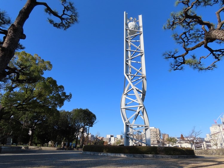 1967年に建てられた時計塔。平和記念公園のもっとも北側、相生橋の近くにあり、毎日朝8時15分にチャイムがなります。3本のねじれた鉄塔の上に球体の時計が乗ったデザインで、対岸の原爆ドームの永久保存に呼応して建てられたそうです。「残したい日本の音100選」にも選ばれています。