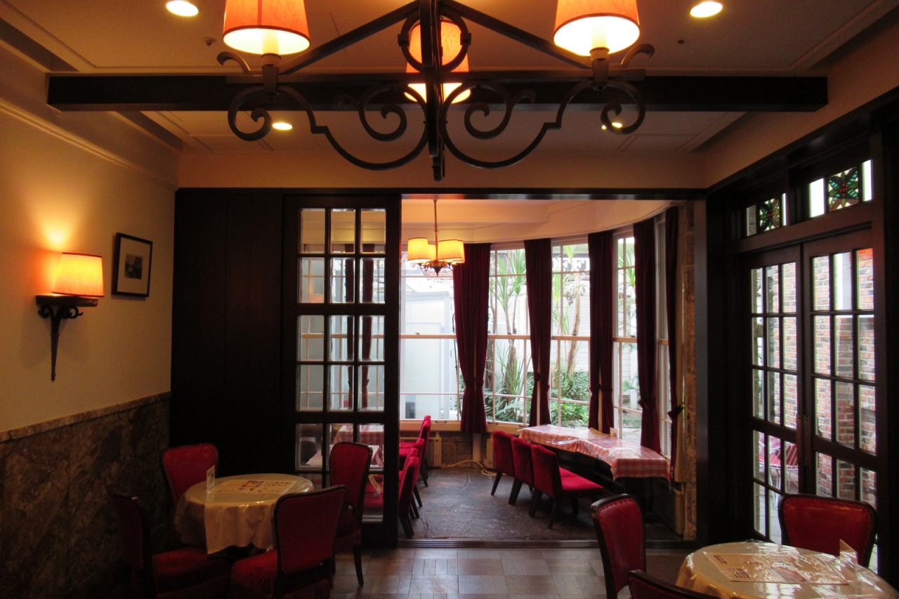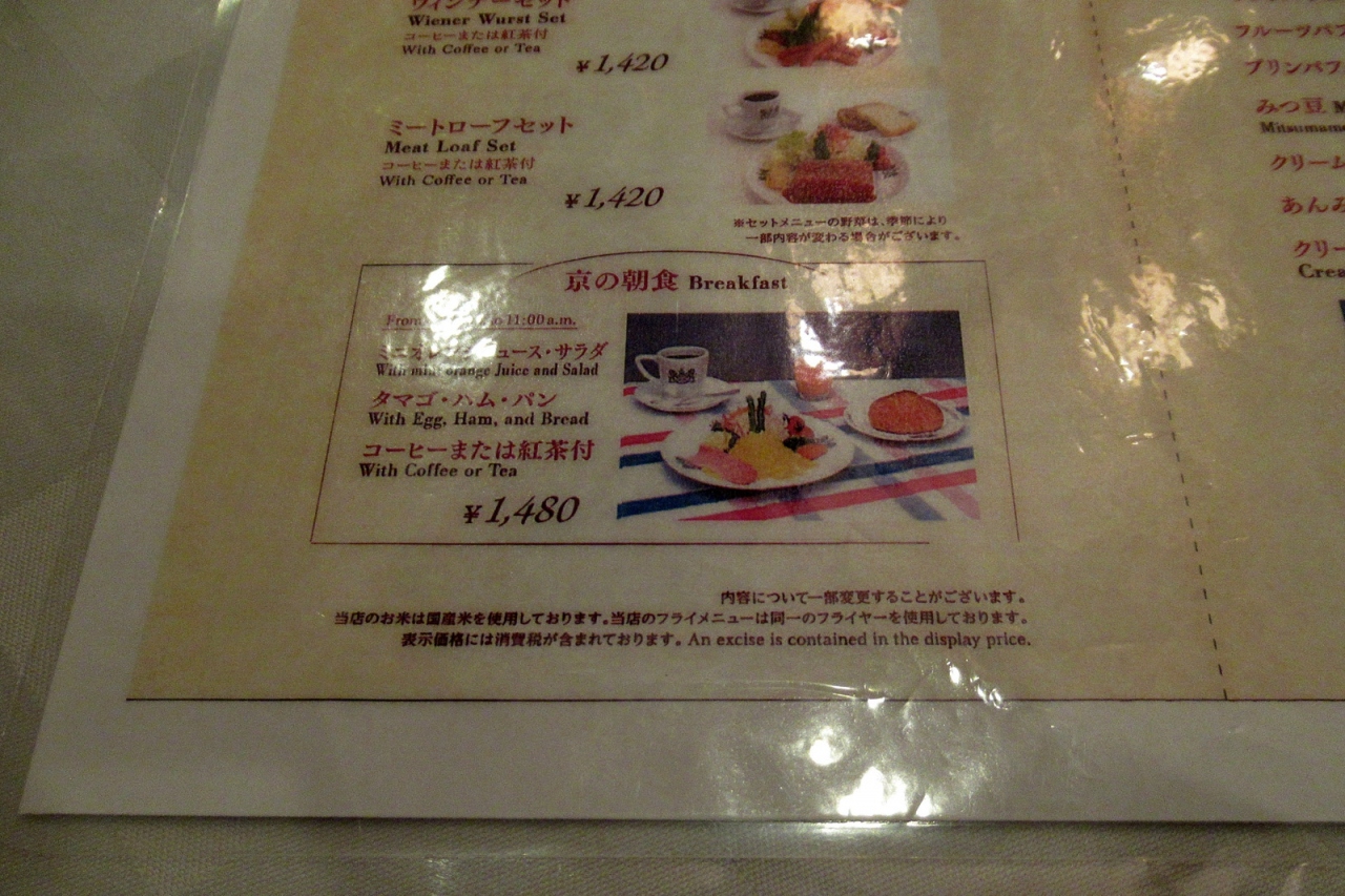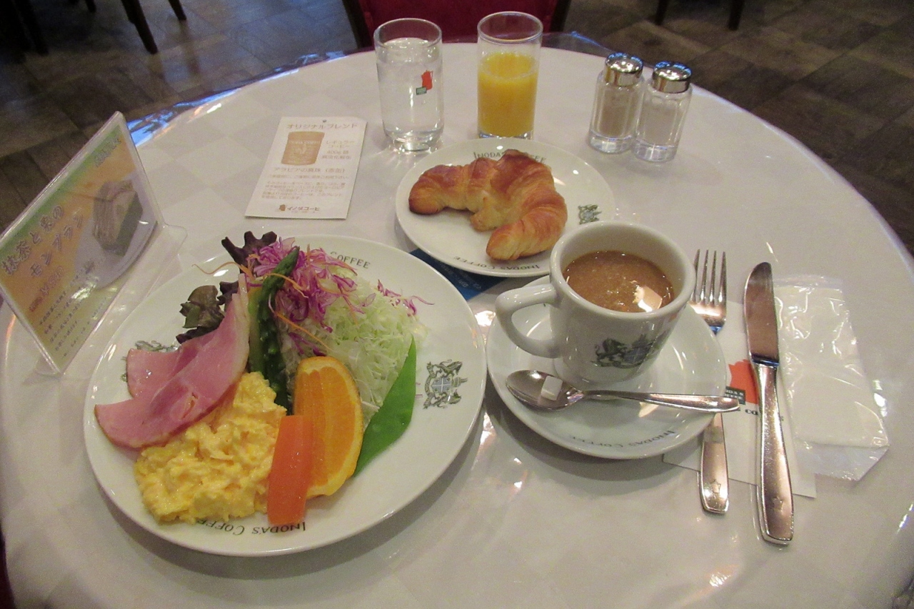 京都を代表するコーヒー店の本店です。京都市中心部に数泊すると一度は利用したいと思うお店になります。今回も開店時間少し過ぎたあたりにうかがいました。伝統的な白いシャツ・ネクタイのウェイターさんから座席、いわゆる旧館・新館の希望を尋ねられますが、今回も旧館を希望しました。注文を取りに来たのは、こちらもウェイトレスさんらしい服装のウェイトレスさん。前回同様「京の朝食」を注文し、コーヒーもイノダ式の砂糖・ミルク入りにしました。郷に入れば郷に従えですね。ノスタルジックな内装の旧館でサラダ・クロワッサン・ハム・スクランブルエッグという正統派の朝食をいただき、ノスタルジックなコーヒーを飲んでいると、しばし文豪になったような気分になります。