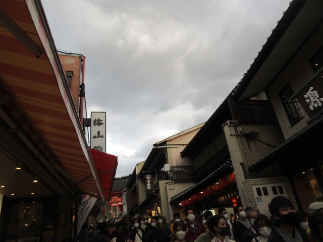 バス停方面から清水寺に伸びている坂です。まあまあ急な坂です。最初は静かな感じの通りなのですが、坂の両側には寺に近づくにつれてお店がたくさん。京都らしいお店もあって、観光客にはとても楽しい通りですが、その分混雑もしていて、ちょっと密でした。でもいろいろ購入デッキてよかったです。