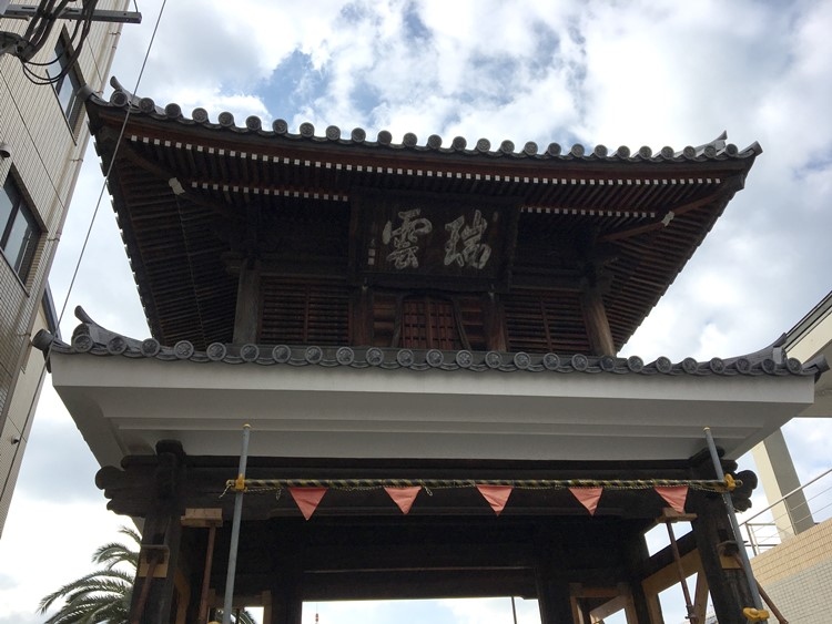 唐人町の中心とも言える黒門川通りから真っすぐ参道が伸びていて、二層の立派な山門が聳えています。ですが、訪問時は工事中のためか関係車両が境内にどんと駐車しており、建物の撮影はできず。そのうえ寺名の記された門柱も見つけられませんでした。号は瑞雲山で真宗東本願寺派の寺院です。福岡藩祖黒田如水ゆかりのお寺らしいです。