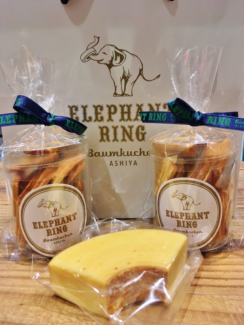 芦屋にあるバウムクーヘン専門店です。阪神芦屋駅とJR芦屋駅の中ほど、お店前の通りからは教会が見えてとても雰囲気が良い場所にあります。お店前に置かれているかわいい象が目印で、店名は象の鼻でできる輪を見た人は幸せになれるという言い伝えから名付けられたそうです。香料・膨張剤・乳化剤を一切使わず原材料にこだわり続け、職人が手作業で焼いているとのことです。自宅用とプレゼント用に日持ちするバウムラスクと、カットしたバウムクーヘンを購入しました。バウムラスクはバウムクーヘンの層がちゃんと入っていて、とても薄くパリッとした軽い食感、ちょっとしたプレゼントに丁度良いサイズです。店員さんも親切で試食もどんどん勧めてくれます。商品の味が前もってわかるので安心して購入できました。