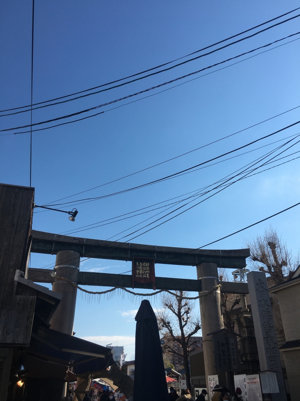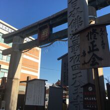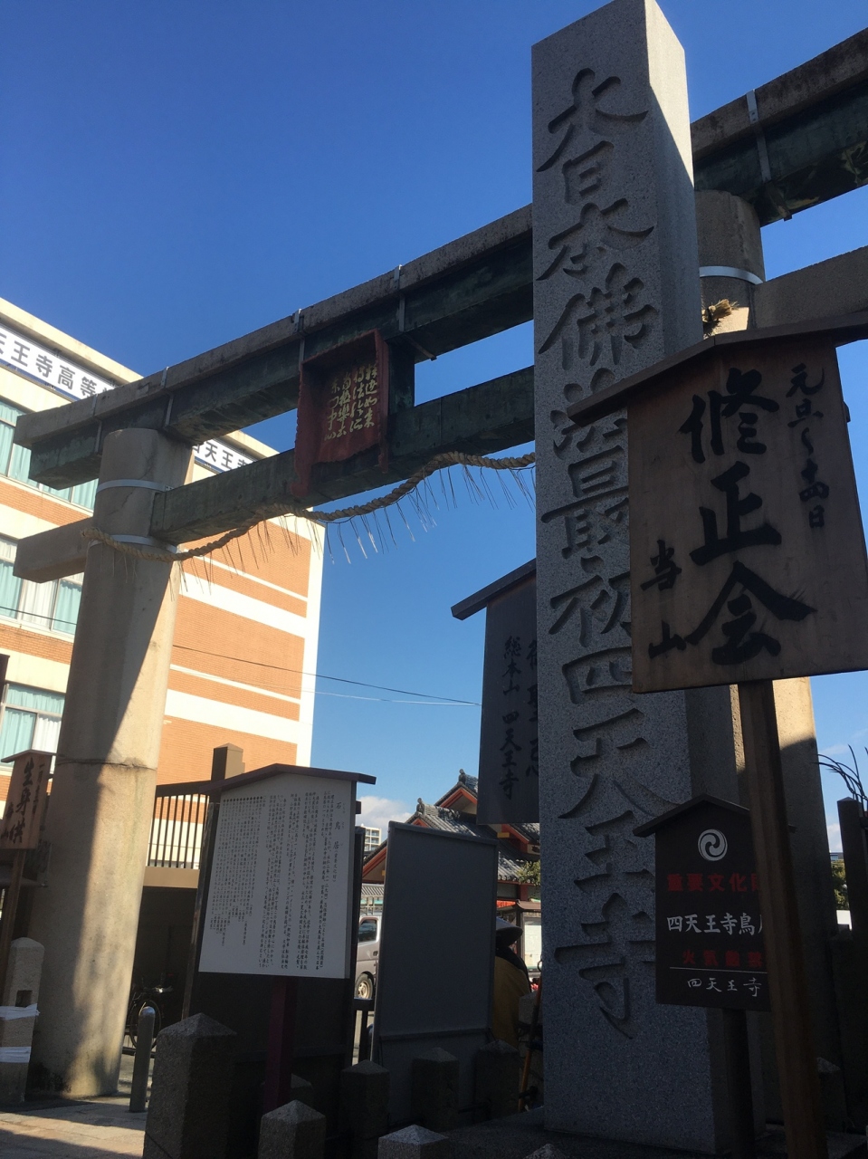 石鳥居の前面にある縦長の石碑で力強い太い字で『大日本佛法最初四天王寺』と書かれ、境内に入る前に気持ちが昂ってくるような石碑でした。鳥居よりは低いですが高さがあり見上げることとなります。人が多いエリアです。