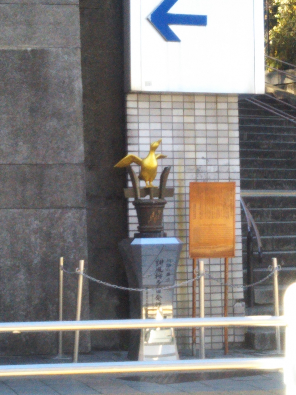 ちょっと変わった樽の上に金の鴨が乗っている碑となっています。