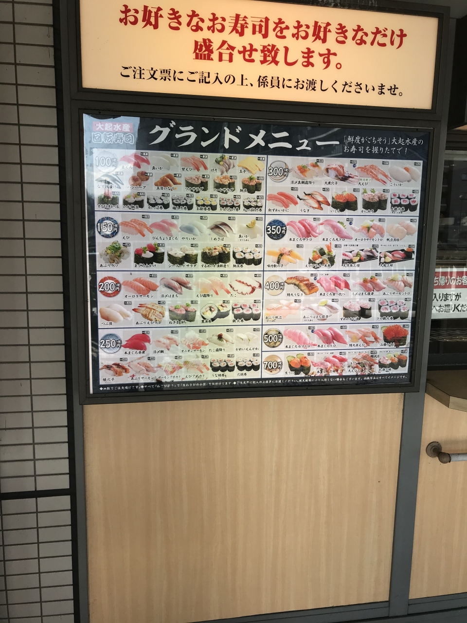 南海高野線北野田駅から直結の「アミナス北野田」にお店があるので、駅からだと雨に濡れることもありません。また近くのスーパー「サンプラザ」には大起水産の鮮魚店もテナントインしています。大起水産は質に拘った本格志向の回転すしで、一皿の値段は税抜き100円~700円と結構な幅があります。でも価格に見合った味わいが楽しめるお店だと思います。