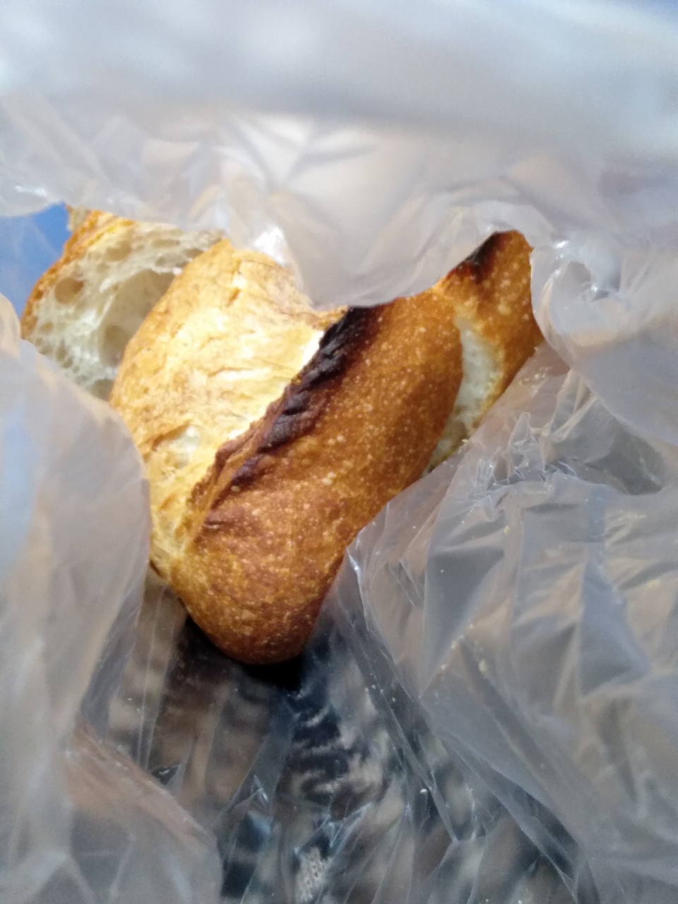 バゲットを購入。カットスライスもサービスでやってくれるので、手がすこし不便なので、非常に助かります。袋は有料ですが、カットしかパンはビニールの透明な袋にはいってわたしてくれる。