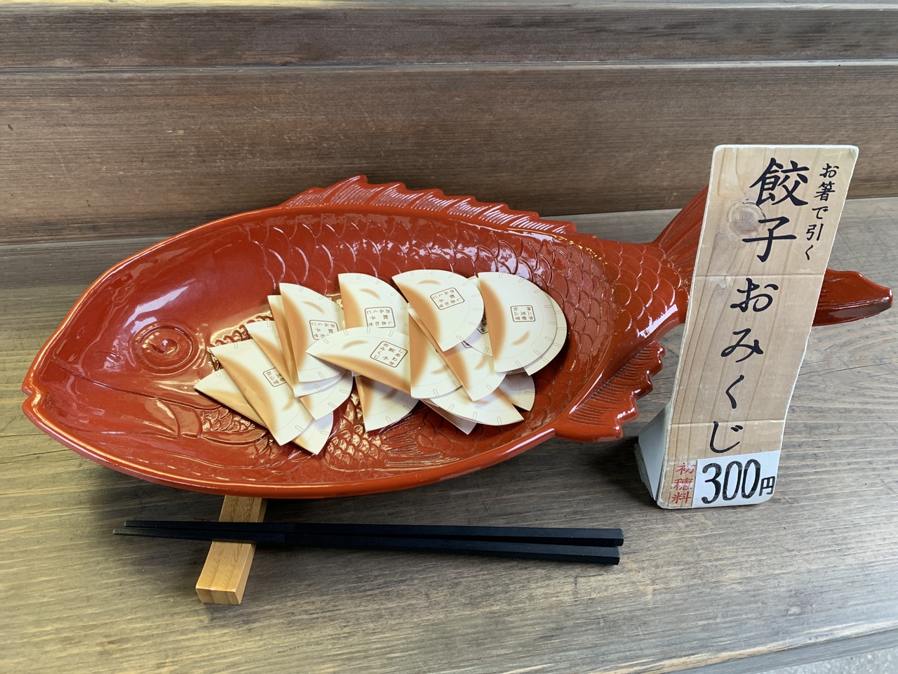 こちらの神社ならではの餃子おみくじ(初穂料300円)があり、お箸を使っておみくじを引きます。餃子の包みを開けるとおみくじだけでなく財布に入れられるプラスティック製の餃子型のお守りが入っていました。
